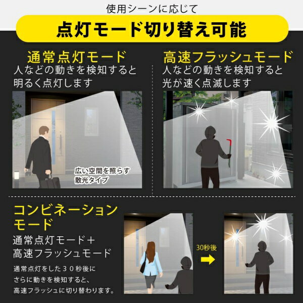 商品詳細 【 特 長 】● 強力な明るさ3200ルーメン ※当社電池式センサーライト比● 高速フラッシュ点滅で不審者に警告、不審者の存在を周囲に知らせます● 使用シーンに応じて点灯モード切り替えができます・ 常時点灯モード…常時点灯します・ 通常点灯モード…人などの動きを検知すると明るく点灯します(点灯時間は約5秒〜5分に調節可能)・ 高速フラッシュモード…人などの動きを検知すると光が速く点滅します・ コンビネーションモード(通常点灯モード+高速フラッシュモード)…通常点灯をした30秒後にさらに動きを検知すると、高速フラッシュモードに切り替わります● 検知範囲は最大約140°、最長約8m● 光源色は昼光色● 保護等級はIP44の防じん防まつ形● 取り付け方法はネジ止め、クランプ止め、ステンレスバンド止めの3通り● コンセント式【 仕 様 】■ 外形寸法:(約)178×高さ209×奥行118mm(本体のみ)■ 質量:約650g(本体のみ)■ 光源:昼光色LED■ 全光束:3200 lm■ 電源:100V 50/60Hz■ 消費電力:31W 1.0W以下(待機時)■ エネルギー消費効率:103.2 lm/W■ 電源コード長:約3m■ センサー:検知方式…焦電型赤外線センサー、検知範囲…最大約140°最長約8m(取り付け高さ約2mの場合)向き調節可能左右各105°■ 周囲の明るさに対応:昼(明るい時でも点灯)/夜(暗い時に点灯)■ 点灯モード(点灯時間):・ 常時点灯モード(常時点灯)・ 通常点灯モード(約5秒〜5分)・ 高速フラッシュモード(約10秒)・ コンビネーションモード(通常点灯30秒+高速フラッシュモード)■ 保護等級:IP44(防じん防まつ形)■ 付属品:コンクリート用スリーブ×2本、ネジ×2本、クランプ台、L形ボルト(ちょうナット、ボルトカバー付き)、保証書付取扱説明書