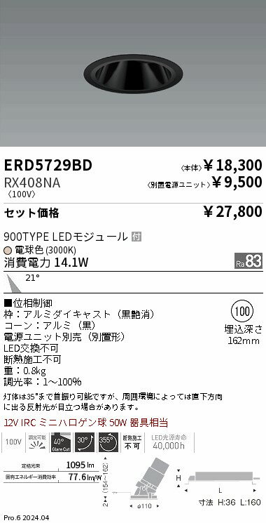 【ご一読下さい】・こちらの商品はメーカー取り寄せ商品となります。納期がかかる場合がございますので、ご注文前に在庫のお問合せをお願い致します。・メーカーに在庫が無く、商品をご用意できない場合、納期2か月を目途にご注文の商品をキャンセルとさせていただいております。・取付工事は専門業者様へご依頼をお願い致します。・取付方法につきましては、ご購入前にメーカーサイト等をご確認下さい。・商品画像に電源別売、ランプ別売の記載がある商品については本体のみの販売となります。専用電源・ランプが必要の場合は別途ご購入をお願い致します。・ご注文確定後のキャンセル・返金・返品・交換を承ることは出来かねます。不良品の場合のみ返品・交換対応致します。ERD5729BD_RX408NA LED ダウンライト ENDO 遠藤照明