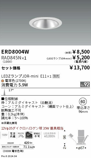 【ご一読下さい】・こちらの商品はメーカー取り寄せ商品となります。納期がかかる場合がございますので、ご注文前に在庫のお問合せをお願い致します。・メーカーに在庫が無く、商品をご用意できない場合、納期2か月を目途にご注文の商品をキャンセルとさせていただいております。・取付工事は専門業者様へご依頼をお願い致します。・取付方法につきましては、ご購入前にメーカーサイト等をご確認下さい。・商品画像に電源別売、ランプ別売の記載がある商品については本体のみの販売となります。専用電源・ランプが必要の場合は別途ご購入をお願い致します。・ご注文確定後のキャンセル・返金・返品・交換を承ることは出来かねます。不良品の場合のみ返品・交換対応致します。ERD8004W_RAD845N LED ダウンライト ENDO 遠藤照明