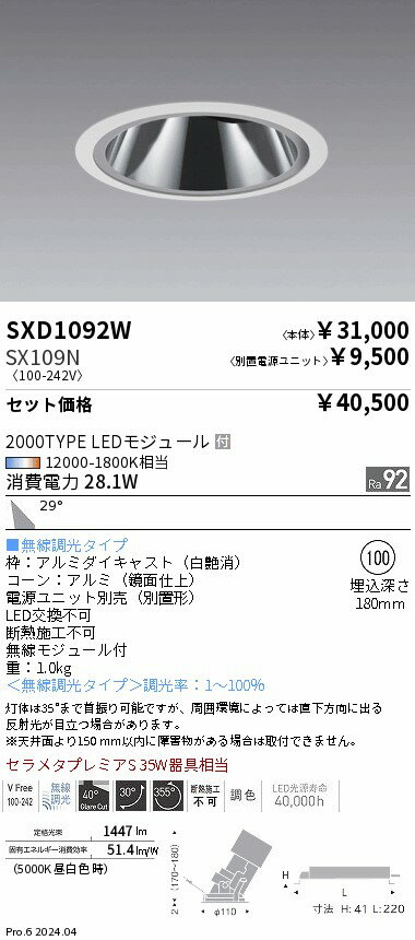 SXD1092W_SX109N LED ダウンライト 調光調色 12000K-1800K相当 無線調光 ENDO 遠藤照明 エンドウ 【3980円以上(税込)で送料無料】
