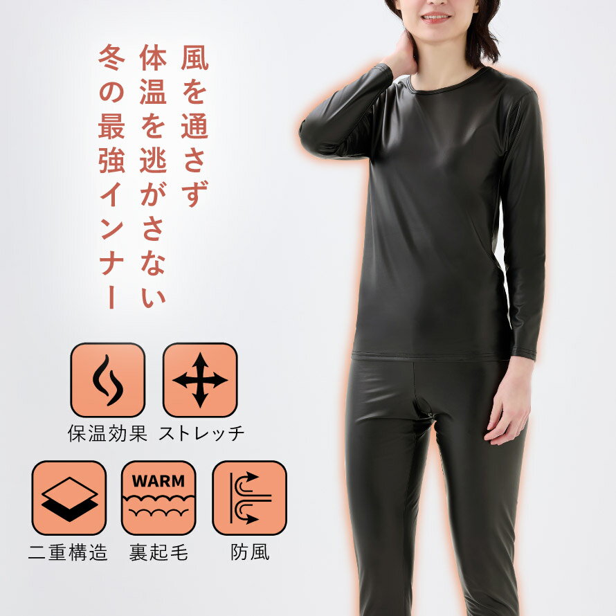防風インナー【上下セット】レディース 防寒 バイク ラミネート 裏起毛 ロングタイツ 長袖 シャツ パンツ 暖かい 冬 保温 風を通さない あったか ストレッチ 防風保温ストレッチウエア上下セット レディース 40代 50代 60代 70代 ゴルフ