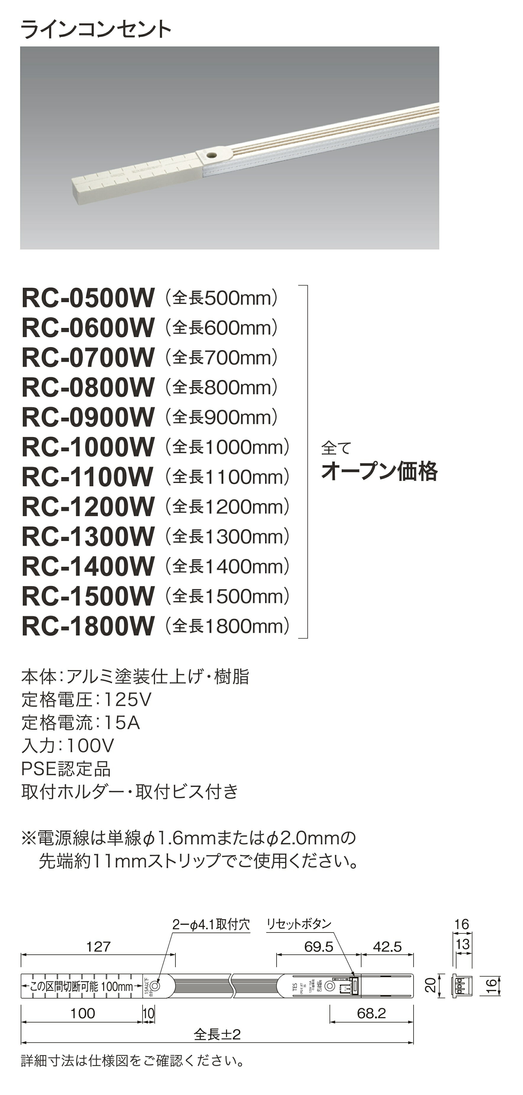 ラインコンセント RC-0900W 什器用電源レール 900mmタイプ 白 UNITY/ユニティ