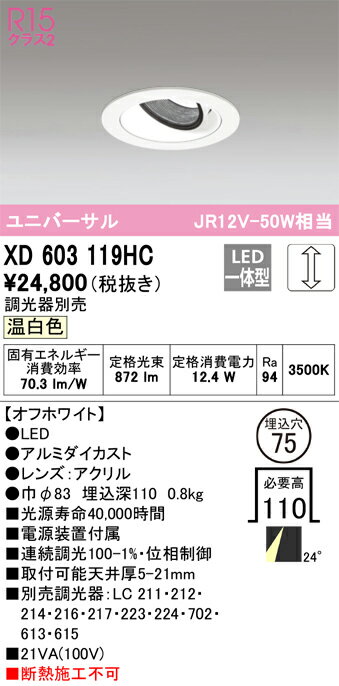 ODELICオーデリックLEDユニバーサルダウンライトXD603119HC
