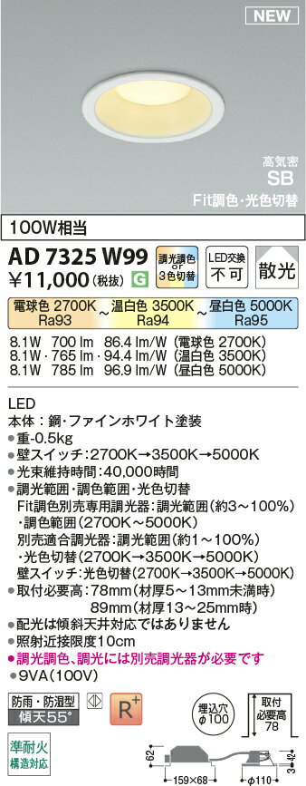 AD7325W99 コイズミ照明(NS) LED ダウンライト 調光・調色/3光色切替 埋込径Φ100 白熱灯100W相当 準耐火構造対応