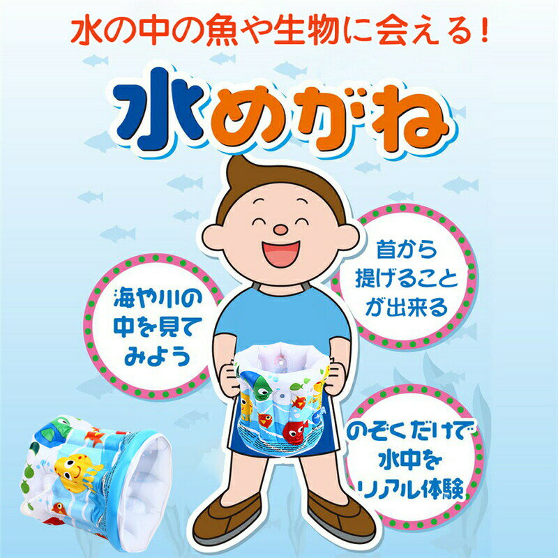 商品説明水に怖い子供に最適な水めがね:水に顔をつけるのが怖いお子様やスノーケルでの呼吸が苦手な方、泳ぎが得意でない方も、水中の世界を楽しむことができます。小さな子供さんでも水中を除くことができます。お子様の安全を考えて、レンズには耐衝撃性に優れたポリカーボネートを採用。取っ手の上の穴にヒモを通せば、首からぶら下げることができます。多用途なのぞきメガネ:水の中をのぞけば、見たことのない世界が広がっているよ。水中写真の撮影に使 ってもOK!お子様の水中観察デビューに最適!のぞきメガネとして海の中生物をはっきり見えますし、また、家族と一緒に釣りに行く時、魚を入れるバケツとしても使えますね。お子様の水遊び、砂遊び、海遊びのおもちゃの収納バケツとしても使えます。無限の遊び方ができるので、お子様の想像力と創造力を広げます。子供は楽しく遊びできます。初心者にもおすすめのシュノーケリンググッズ:小柄なお子様がしっかり乗れるサイズ設計のスノーケリングフロート、スノーケリングの練習に最適なスノーケリングフロート。空気を入れるだけで、のぞきメガネに早変わり、軽量コンパクトで携帯にも便利です。子供から大人まで、楽しく手軽に水中観察できる。バスケット底面はクリアになっているので、浅瀬の貝殻探しにぴったり! 持ち運び用ハンドルひも付き、首からかけて使えば不意に流される心配もありません。空気を抜くとコンパクトに! 簡単に保管でき、持ち運びにも便利です。安全丈夫な素材:お子様の安全を考えて、レンズには耐衝撃性に優れたポリカーボネートを採用。環境にも優しいエコ素材です。バスケット底面はクリアになっているので、浅瀬の貝殻探しにぴったり! 旧モデルに比べて視界が1.5倍広がりました。のぞきメガネは小さなお子様使用可能:展開サイズ:高さ:20cm、 直径:20cm 。折畳みサイズ:直径:20cm、高さ:2cm 。重量:135g。コンパクトになるので持ち運びもラクラク。持ち手が付いているので、小さなお子様も安心してご使用いただけます。こどもの観察興味関心を養います。海川旅行、夏の遊びの必需品になりつつあります。贈り物としてもピッタリ:男の子、女の子も適用します。クリスマスやお誕生日、出産祝いや入園祝いのプレゼントやギフトにもいい選択です。家族や親戚、お友達など大切な人へ最適。ご注意使用目的以外での使用はおやめください。構造上水圧でレンズ回りから水が漏れてくる場合がございます。お子様は少量の水でおぼれる危険性があります。梱包が開けるとき、多少匂いがあるけど、梱包を外した後、1日ぐらい外に放って置いて、匂いが消えてしまいます。お子様が使用される場合は安全のため必ず保護者の目の届く範囲でお使いください。返品について万一、不良品や誤配送など当社原因による場合には、良品の交換にて対応させていただきます。お手数ですが、商品到着後、一週間以内にお電話又はメールにてご連絡下さい。返品商品の到着を確認後、2~3営業日以内に良品を発送させていただきます。発送について楽天市場から指定を受けた委託先である株式会社ECロボが、当店の店舗運営業務を行います。当店で購入された商品は、日本の倉庫からお客様のもとへ発送されます。商品お届けまでに、2~3日程度かかります。ご了承の上、ご注文ください。