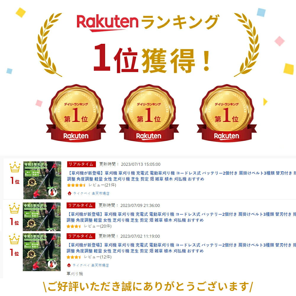 商品情報【高性能コードレス草刈り機】あなたに合う草刈り機をお探しですか?コードレス草刈り機は、あなたのニーズをすべて満たしてくれます。コードレス草刈機は、どこでも気軽に使えます!コードレスでコンセントの確認等の電源確保のストレスから解放!電源がない場所でも使え、取り回しも楽なので作業効率もアップします。壁際や低い場所も手楽にカットできます。家周りや軽作業等には十分な性能、女性や力が弱い方にも使用にも対応できる製品です。※個人差があります。【操作ビデオ】草刈り機の組み立てビデオがあり、必要のお客様は問い合わせにより連絡して入手することができます。【高さ調整可能】最大約120cm長さに延長可能なので、ご使用される方に合わせて腰や足に負担が掛からないように調整できま軽量設計で作業がラクラク!◆3種類の交換可能なブレード:プラスチックブレード安心安全。壁や庭木などの障害物を傷つけず、雑草だけを刈り取ります。茂った草や茎の太い雑草や植木の剪定の刈り込みにマンガン鋼のこ刃がお勧めです。用途に合わせて適合な刃を交換でき、様々なシーンで大活躍!※こちらの商品は殻の材質が軽量設計の為、表面が軟らかくなりますので、細かい傷が付いての可能性があります、性能と安全性に影響が与えませんので、ご安心ください。◆6月多機能新型草刈機は品揃えでコスパが高くて性能がいいです。【車輪取り付けて可能】押すだけで簡単に草を刈ることができます。車輪または部品の追加購入がご希望の方は草刈機部品の専用ページにてご購入ください。【3種類の交換可能なブレード】最大約120cm長さに延長可能なので、ご使用される方に合わせて腰や足に負担が掛からないように調整できま軽量設計で作業がラクラク!◆3種類の交換可能なブレード:プラスチックブレード安心安全。壁や庭木などの障害物を傷つけず、雑草だけを刈り取ります。茂った草や茎の太い雑草や植木の剪定の刈り込みにマンガン鋼のこ刃がお勧めです。用途に合わせて適合な刃を交換でき、様々なシーンで大活躍!※こちらの商品は殻の材質が軽量設計の為、表面が軟らかくなりますので、細かい傷が付いての可能性があります、性能と安全性に影響が与えませんので、ご安心ください。◆6月多機能新型草刈機は品揃えでコスパが高くて性能がいいです。【安全&安心 3つのポイント】1.ナイロンブレード樹脂製だから安全。壁や庭木などの障害物を傷つけず、雑草だけを刈り取ります。2.フロントガードコンクリートなどの障害物から刃をガード。3.安全カバー高速回転する刃からしっかりガード。【関連検索ワード】充電式草刈機 草刈り機 コードレス最新型 伸縮 角度調整 枝切り 芝生 畑 雑草 植木 刈払機 軽量 dcモーター【注意事項】※こちらの商品は殻の材質が軽量設計の為、表面が軟らかくなりますので、細かい傷が付いての可能性があります、性能と安全性に影響が与えませんので、ご安心ください。 メーカー希望小売価格はメーカーサイトに基づいて掲載しています メーカー希望小売価格はメーカーサイトに基づいて掲載しています メーカー希望小売価格はメーカーサイトに基づいて掲載しています【楽天1位★補助輪付き】草刈機 草刈り機 充電式 電動草刈り機 コードレス式 女性 21v バッテリー付き 3種類 替刃付き 肩掛けベルト 除草機 伸縮式 長さ調整 角度調整 軽量 女性 電動刈払機 芝刈り機 芝生 剪定 畑 雑草 植木 刈払機 枝切り 草刈り機 替え刃3種類 【1年保証】補助輪付き★バッテリーセット 充電式草刈機 草刈り機 コードレス 伸縮 角度調整 枝切り 芝生 畑 雑草 植木 刈払機 軽量 稼動 軽快&安全に雑草をザクザクカット!高速回転するナイロンブレードは切れ味バツグンです。◆安全&安心 3つのポイント1.ナイロンブレード樹脂製だから安全。壁や庭木などの障害物を傷つけず、雑草だけを刈り取ります。2.フロントガードコンクリートなどの障害物から刃をガード。3.安全カバー高速回転する刃からしっかりガード。◆【PSE認証済マーク】届出事業者名:三恵商事合同会社PSマークの種類:PSE◆ブレードの取り付けが簡単本体の突起部にブレードの大きい方の穴を通して先端側に引っ張って音がするまではめ込むだけ。◆壁際や低い場所もすいすいカット重さ約1.6kg。軽量&コードレスで小回りが利くからどこでも気軽に使えます。◆作業場所に応じて細かい調節も可能補助ハンドル:位置と角度を調節できます。パイプ:長さと角度を調節できます。ヘッド:上下に角度調節できます。◆リチウムイオンバッテリー搭載約40分の連続運転が可能。広範囲の刈り込みにも活躍!◆高速充電 約60分60分で充電完了!気が向いた時、待たずに使えます。電池残量があっても継ぎ足し充電可能。充電時間を節約できます。◆ダブルロックで誤操作防止安全スイッチと運転スイッチを同時に押すと起動するダブルロック仕様。不意の誤操作を防ぎます。 2