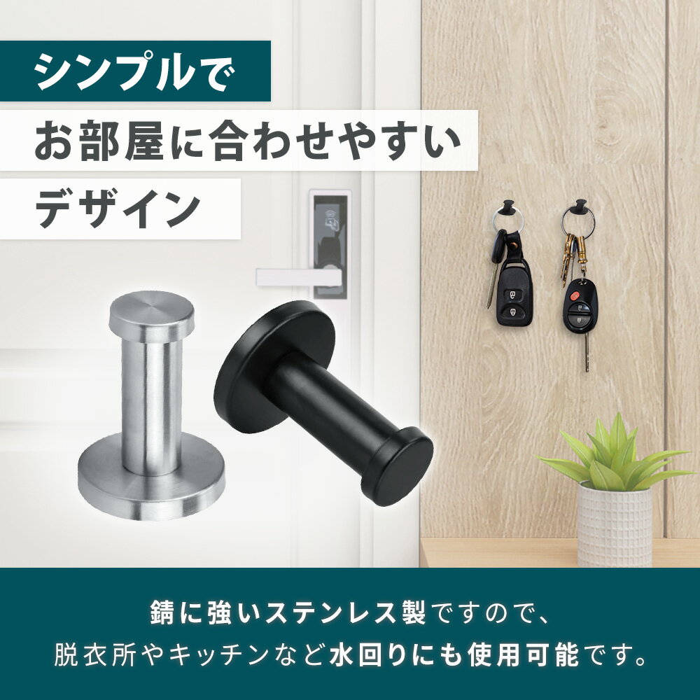 フック 壁 ステンレス製 引っ掛け 壁掛けフック ネジ付き ウォールハンガー 壁掛け ハンガーフック ウォールフック シンプル 収納 耐久性 簡単取付 玄関収納 黒 玄関 帽子掛け 洋服掛け 吊り下げ シンプルでおしゃれ。ネジ付きで簡単取付!お得な6個/12個セットのステンレス製壁掛けフック。玄関やお部屋の収納に便利。 ステンレス製の壁掛けフックセットです。ネジ付きで簡単に取り付けでき、玄関やリビング、寝室などさまざまな場所で活躍します。お得な6個/12個セットで、帽子やバッグ、コートなどをスッキリ収納。シンプルなデザインでどんなインテリアにも馴染みやすく、高耐久なステンレス素材使用で錆びにくく長く使えます。玄関収納、洋服掛け、帽子掛け、吊り下げ収納などに最適です。【取り付け方法】1.取り付けたい位置を決めて印をつけます。2.付属の専用ネジを使ってしっかり固定します。3.台座カバーをかぶせ、ネジを外に出します。4.フック部分をネジに合わせて取り付ければ完成です。ネジ付きなので特別な工具を使わず簡単に設置でき、女性でもラクラク取り付け可能。壁や木製ドアなど、設置したい場所に合わせてしっかり固定できます。おしゃれで実用的なステンレス製フックは、お部屋の整理整頓にも、収納スペースの拡張にも便利です。 5