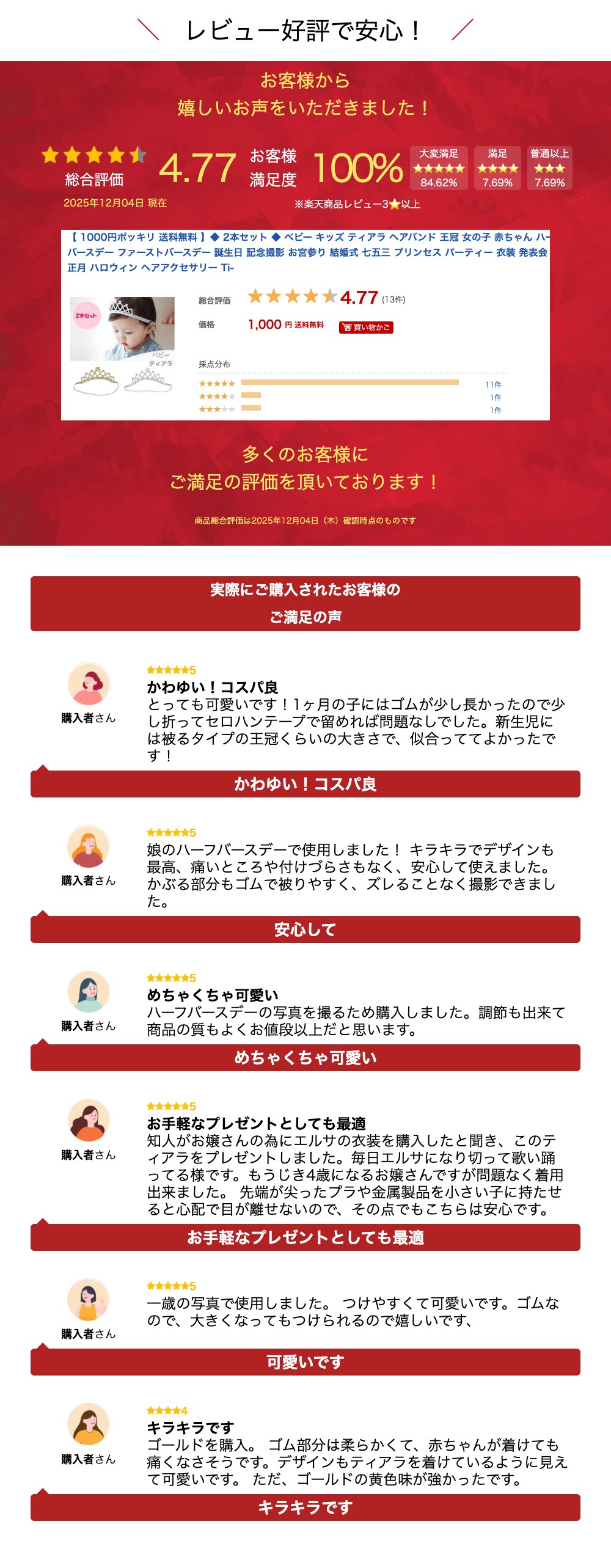 商品説明《 ベビー キッズ ティアラ 》 ・やさしいゴムバンド仕様で赤ちゃんの頭にも負担なし ・2本セットだから姉妹でお揃いもOK♪ ・新生児から6歳頃まで長く使える万能アクセサイズ・平置き長さ:約20cm(ゴムで伸縮します) ・対象年齢:0から6歳ごろまでバリエーション1) ゴールド(2本) 2) シルバー(2本) 3)ゴールド(1本)+ シルバー(1本)注意事項海外インポート商品について 日本国内で検品済みですが、海外製のため接着剤のはみ出しやストーンのズレが見られる場合がございます。ご理解の上でお求めいただけますと幸いです。関連ワードベビー キッズ ティアラ ヘアバンド 王冠 カチューシャ ヘアアクセサリー 女の子 赤ちゃん 新生児 0歳 1歳 2歳 3歳 4歳 5歳 6歳 対象年齢 長く使える ゴムバンド ソフトゴム 2本セット ゴールド シルバー プリンセス ドレス 衣装 お姫様 ハーフバースデー お誕生日 記念撮影 お宮参り ニューボーンフォト 結婚式 パーティー 発表会 七五三 お正月 フォーマル イベント用 コスチューム かわいい プレゼント ギフト対応 送料無料 関連商品赤ちゃん サングラス ヘアバンド セット ベビーヘアアクセサリー リボ...【 1000円ポッキリ 送料無料 】 ◇ 2個セット ◇ パール付き ...ワイヤーポニー 巻くだけアレンジ♪ ポニーテール ヘアワイヤー レザー...1,580円1,000円1,000円【2本セット】三つ編み 編み込み メッシュ PA Ver. エクステ ...【 1000円ポッキリ 送料無料 】 ベビークラウン ニットハット ク...ケーキトッパー 数字 4点セット ナンバー スター 星 ケーキ 飾り ...1,500円1,000円1,000円アクリルタイプ 女の子 シルエット ケーキ トッパー ガール バースデ...【 1000円ポッキリ 送料無料 】大小 スター ケーキトッパー ゴー...レッド ハート ケーキトッパー アクリル プラスチック製品 飾り付け ...1,000円1,000円1,000円アクリルタイプ 記念日トッパー アニバーサリー ケーキトッパー 結婚記...ONE 木製 ケーキトッパー ラウンド ファーストバースデー one ...紙製 ケーキトッパー TH お祝い用 スクラップブッキング ケーキ デ...1,000円1,000円1,000円関連商品はこちら【オーダー名入れ】サイン風フォント ポ...【オーダー名入れ】スマイル ポーチ☆ 選...【 名入れ 巾着 筆記体 】 巾着袋 ssdot...