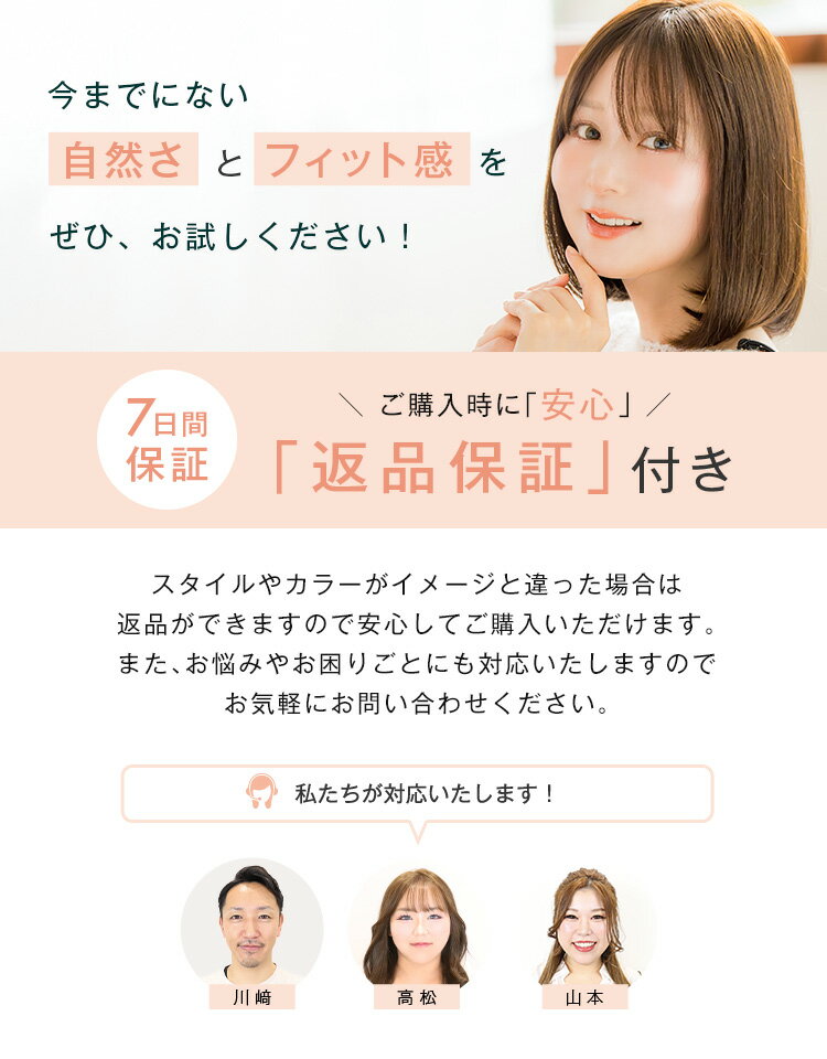 商品説明 圧倒的な自然さを誇る人毛を100%使用! さらに生え際のレースや抗菌・防臭のキャップなど仕様にもこだわったコスパ最強のウィッグが完成。 一般的な相場10万円前後のところ23,800円〜でお届けいたします。 注意事項 最大180°/推奨温度:120℃〜160℃/コテ・アイロン・ドライヤー等でのスタイリング調整可能/シャンプー可能(ノンシリコンは不可) 検索ワード 〇Sサイズ 〇Mサイズ 〇人毛100% 〇自然な人毛ウィッグ 〇マシンメイド 〇I型ノーマル 〇ショート 〇ミディアム 〇ショートボブ 〇ボブウィッグ フルウィッグ 自然 ミディアム かつら バレない 女性 医療用 コスプレ ハロウィン 普段使い ハイトーン グラデーション プリンカラー おしゃれ 普段使い 和装 卒業式 入学式 結婚式 成人式 インナーカラー カール ストレート シースルーバング 耐熱 バレンタインデー ホワイトデー クリスマス 母の日 LINEASTORIA リネアストリア 送料無料ウィッグ ナチュフィット人毛100% ショート/ボブ/ミディ CONCEPT コンセプト POINT ポイント REVIEW レビュー Staff:Shoko 着用スタイル:ショート 着用カラー:ナチュラルブラック 着用サイズ:Mサイズ いつものマシンメイドよりも少し小さく感じましたが、締め付けが強いこともなく快適に過ごせました♪ ブラックですが自然な黒髪で普段使い良いと思います! 人毛なこともありふんわりと柔らかい手触りが着用していても心地よかったです!レースフロントも以前よりも肌あたりがよく、おでこにフィットしました♪女性らしいショートスタイルで丸みもかわいく使いやすいと思います♡ Staff:Rina 着用スタイル:ボブ 着用カラー:ダークブラウン 着用サイズ:Mサイズ 地毛が長く締め付けが苦手なので、一番端にしてちょうど良いサイズ感でした! 人工毛のダークブラウンよりやや明るく感じました。年代やパーソナルカラーを問わず、誰でも着用しやすいカラーだと思います! 人毛100%なので、とにかく自然で肌当たり◎前髪はそのままだと長く感じたので巻いて横に流しました。ややシースルーな前髪が今っぽく、レースフロント仕様なのでおでこが透けて見えても自然♪ 丸顔なのでボブは似合わないと思っていましたが、すっきりしたボリュームのボブスタイルなので違和感なく自然に着用できたと思います! Staff:Moeka 着用スタイル:ミディ 着用カラー:ダークブラウン 着用サイズ:Mサイズ 安定感が欲しいのでアジャスターを一つ詰めて着用しました♪ 落ち着いたブラウンで日常使いしやすいです♡ 王道のレイヤーストレートがかわいい!! 人毛なのでスタイリングは必要ですがアイロンを通すだけでまとまってくれるのでうれしい♪前髪はレースフロントなので、表面をサイドにわけてシースルーにして着用しています。 HOWTO 着用方法 SPEC サイズ・仕様 製法 マシンメイド(部分手植え) 毛材 人毛100% つむじ レース キャップ オールネット サイズ Sサイズ / Mサイズ カラー ナチュラルブラック(自然な黒) / ダークブラウン(こげ茶色) / チョコブラウン(茶色) (全3色) 耐熱性 最大180℃/推奨温度:120℃〜160℃ その他 レースフロント仕様 取り外し可能付属クリップ(金属使用) コテ・アイロン・ドライヤー等でのスタイリング調整可能 シャンプー可能(ノンシリコンは不可) 生産国 中国 ATTENTION ご注意 INFO アイテム情報 ブランド LINEASTORIA(リネアストリア) 商品番号 1110531 商品名 ナチュフィット人毛100% ショート/ボブ/ミディ カテゴリ フルウィッグ ショート ミディアム 配送方法 宅配便 送料無料 その他 ウィッグネット付