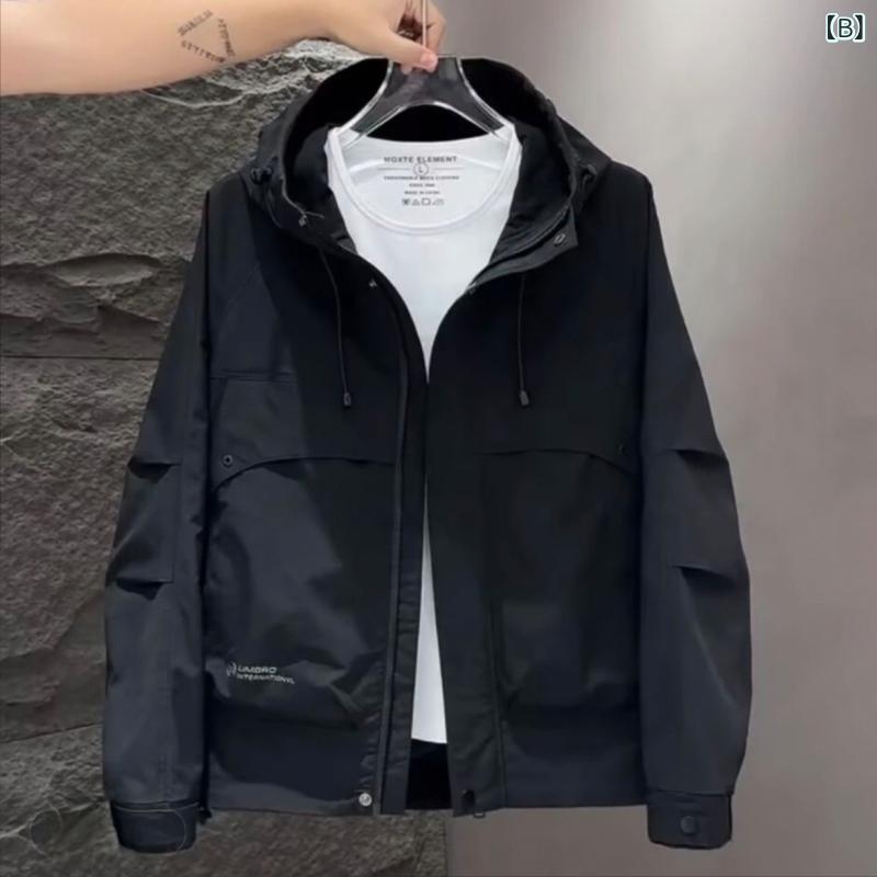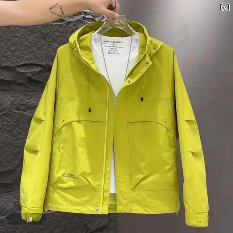 ジャケット メンズ 春秋 薄手 フード付き 防風 ワークスタイル ブルゾン ジャンパー 男性用 トップス 蛍光イエロー ブラック カーキ カラメル ポリエステル