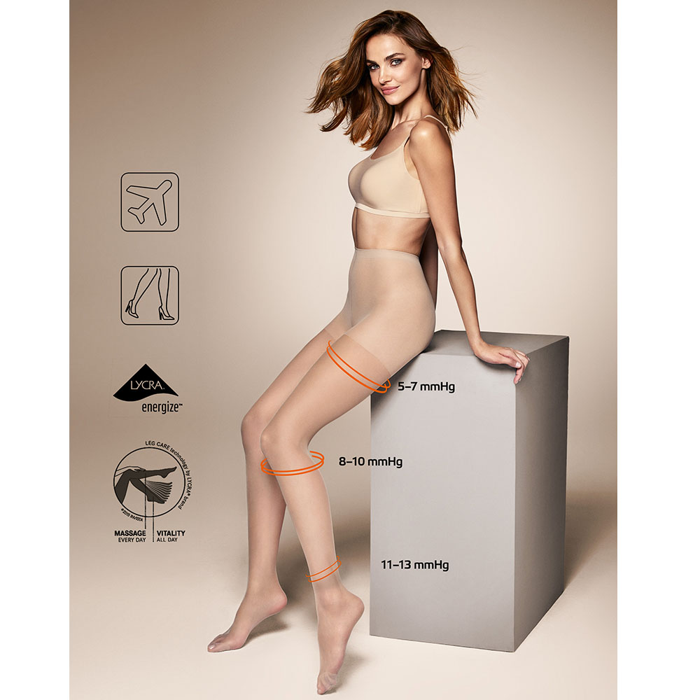 同グループコレクションはこちらです。【仕様】■素材:ポリアミド 74%、ライクラ 23%、コットン3%■つま先補強タイプ■足型:なし■コットンマチ:あり■ウエストバンドの高さ:約13mm+約50mm■ライクラファイバー使用■原産国:EU■厚 み:20デニール【サイズ】2:日本サイズ S3:日本サイズM4:日本サイズ L5:日本サイズ XLEU直輸入のインポート・ストッキング。マットな質感が美しい20デニールの着圧ストッキングです。足首、ふくらはぎ、太腿と段階的な加圧で脚の血液循環を刺激。脚のむくみや怠さをサポートし、スッキリ軽やか美脚へ導きます。20デニールと薄手ながらも、サポート力があり肌の色ムラを隠します。ウエスト非圧迫タイプだから締め付けすぎず、お腹周りリラックス。約4cmのウエストバンドはソフトでお腹に食い込みにくくなっています。目立ちにくいフラットなつま先補強タイプだから、伝線しにくく長持ち。パンティ部分はサポート力をアップし、ぽっこりお腹も安心です。通気性が良く、肌触り爽やかなコットンマチ付き。カラーは、cognac/ベージュ、nero/ブラックの2色展開です。☆画面上の色はご覧になるモニターの環境により実物とは異なる場合がございます。