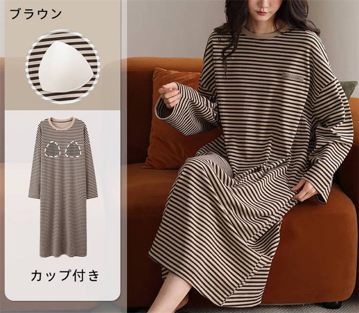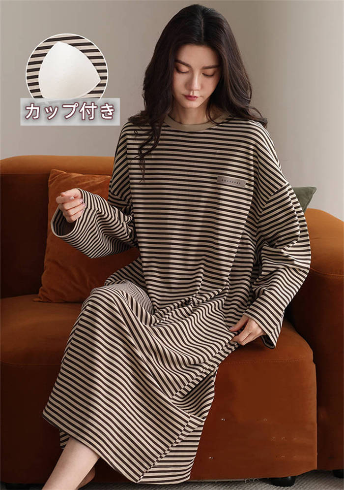 カップ付き ルームウエア 100%綿 ワンピース ボーダー レディース 新作 ネグリジェ ラウンドネック 長袖 プルオーバー パジャマ コットン ロング ゆったり 大きいサイズ カジュアル 大人 可愛い 春 夏 秋 寝間着 ガーリー 睡眠 快適 ナイトウェア 部屋着 通気性 送料無料