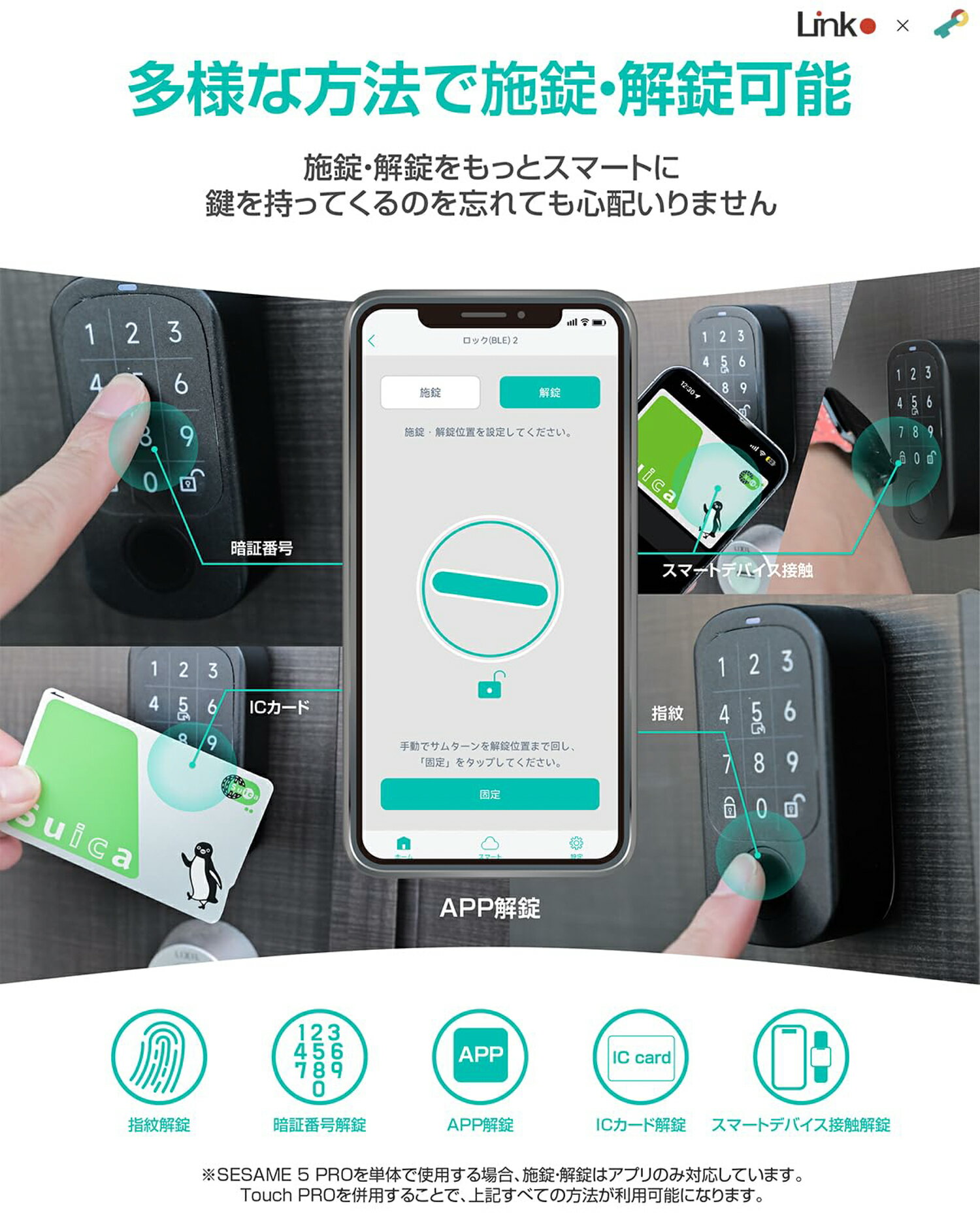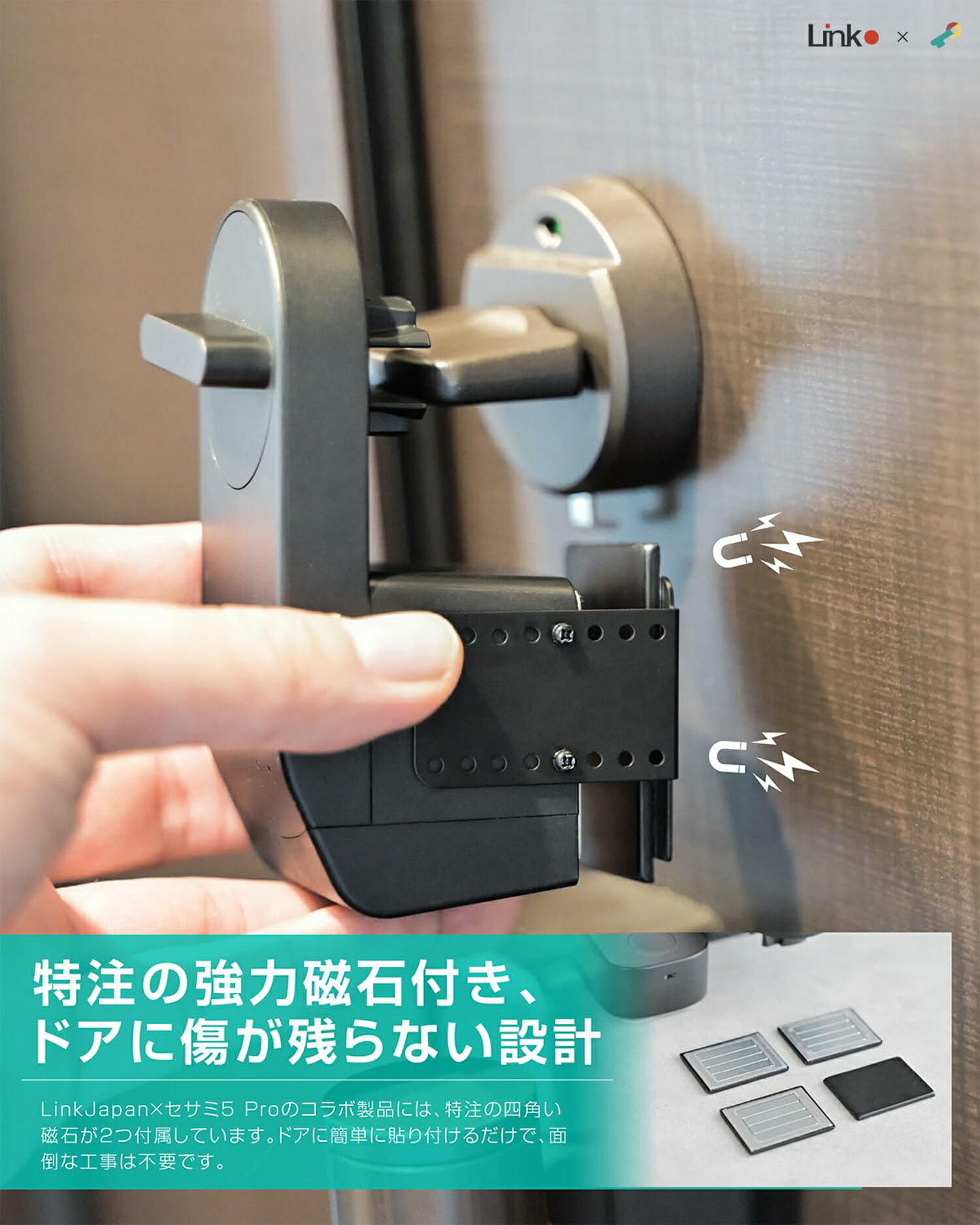 【LinkJapan x SESAME コラボモデル】 SESAMEが開発したスマートロック「SESAME 5 PRO」をLinkJapanの「HomeLink」アプリで操作できるコラボモデルです。HomeLinkアプリを使うことで、アプリ一つで家全体をリンクし、よりスマートで快適な生活をサポートします。 【多種解錠方法対応】 「SESAME 5 PRO」とTouch PROの連携利用により、指紋認証、カードリーダー、暗証番号の3つの解錠方法を選択でき、便利で安全にご利用いただけます。最大100個の指紋を登録可能で、家族や親戚、友人も登録でき、登録後の削除も簡単です。さらに、FeliCa(Suica、PASMOなど)やMIFARE対応のカードも使用でき、最大1000個のカードを登録可能です。NFCタグもカード代わりに使えるため、登録後の削除も手軽に行えます。※上記機能を利用するには、Touch PROとの連携が必要です。 【特注専用強力磁石付き】 特注の強力磁石を採用しており、従来の粘着テープ式とは異なる新しい取り付け方法を実現しました。ドア表面を傷つけることなく簡単に取り付けが可能で、強力な磁力でしっかりと固定されるため、従来の貼り付け方式に比べて安定性と耐久性が向上しています。また、磁石式のため、賃貸マンションにお住まいの方でも安心してご利用いただけます。引っ越し時にドアを傷つける心配がなく、粘着跡による修繕費用のリスクも回避できます。※磁力が非常に強力なため、正しい使用方法については付属の磁石使用方をご確認ください。 【付属品リスト】】 ・特注専用強力磁石・SESAME用3Mテープ ・バッテリーカバー(TouchPRO) ・スライドカバー・高性能高容量3.0V 1800mAhのCR123A 電池(2本*2) ・本体シェル素材用ネジ ・バッテリーカバー用ネジ 【国内メーカーの安心サポート!】 AWS使用&SSL暗号化で高セキュリティを実現。国内専門チームが対応し、安心と信頼のスマートホーム体験を提供します。 メーカー希望小売価格はメーカーサイトに基づいて掲載しています メーカー希望小売価格はメーカーサイトに基づいて掲載しています メーカー希望小売価格はメーカーサイトに基づいて掲載しています