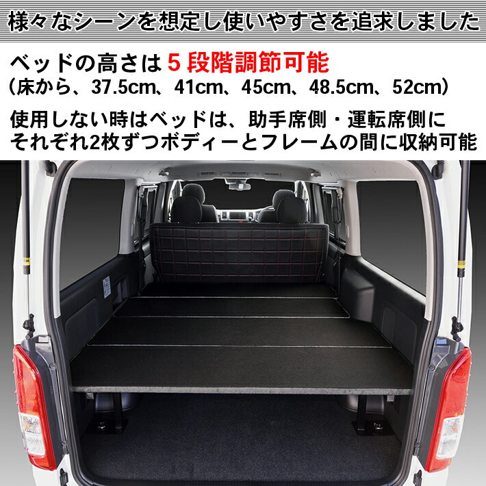 今なら、ベッドキットお買い上げで、送料無料キャンペーン! 送料無料期間(2025年11月28(金)0:00〜2025年12月4日(木)24:00) 期間限定、このチャンスをお見逃しなく!! 【注意】個人宅・北海道・沖縄・離島はキャンペーン対象外ですので予めご了承ください。 ★商品説明★ ⇒デザイン、強度、使いやすさにこだわった頑丈な作りです。 ⇒ベッドの高さは5段階調整可能(床から、37.5cm、41cm、45cm、48.5cm、52cm) ⇒板は24mmを使用しています。 ⇒ベッドのサイズは4枚で縦1800mm×横1500mmです。 ⇒安心と信頼の日本製。 ■刺繍部分■ ★自分の好きな文字を入れたい場合は無料で入れさせていただきます。(全角・半角問わず15文字以内) ★糸の色は10色(赤・黒・白・灰・青・橙・緑・黄・銀・金)あります。 ★人気の書体を取り揃えています。(上の書体見本よりお選びください) ★3D刺繍は書体6パターン、糸の色はブラックのみです★ ★オリジナルの刺繍をする際(HIACE、ハイエース、ダークプライム、ダークプライム2、ダークプライムS)コンプライアンス上使用できません。 ★刺繍無しのご注文は承れません。★ししゅう文字の書体イメージ一覧★ ■マット部分■ ★ブラックパンチとグレーパンチを使用。 ★一般的に売られている物は1枚張りで張り込めるので強度が弱く表面が破れてきます。当社のパンチは縫製をしないと張れないので強度は抜群です。 ★輸入品のように全部が雑(張り込み時のシワ、ガタつき、塗装剥がれ、材料の低品質、裏張り時の適当なタッカーの打ち込み)ではないです。 ★使用しない時はサイドに収納可能です。 ★マットは4枚で45kgです。 ★耐荷重は200kgです。 ■フレーム部分■ ★角フレームから丸フレームに変更しました。 ★上下が非常にスムーズです。 ★職人が1本1本手作りで丁寧に仕上げました。 ★安価な輸入製品のようなフレーム部分のガタツキがほとんど無く頑丈な作りになっています。 ★ベッドの強度をさらに高めたい方には強化バーの販売もいたしております。 フレームの上に載せるだけで板のしなりを解消できます。 強化バー4本取り付けると耐荷重500kg以上になります。 ベッドキットと同時ご購入の場合は、ベッドキットに同梱させていただきます。 ご注文は下の画像をクリック。↓ ■取付について■ ★荷室に付いているタイダウンフック(4ヶ所あり)のボルトの穴を使用。そのため、フロアに穴を開けずに固定できます。 ★取り付けに自信がなくてもご安心ください。取扱い説明書が付いていますので12mmのソケットレンチがあれば15分から30分位で取付け可能です。 ★フレームの側面に小さな穴が空いていますが、塗装する際必要な穴です。使用に関しては問題ありません。 ★ボルトがさらに改良されました! フレームを床に取り付ける際、従来のボルトはタイダウンフックに干渉することがありましたが、改良により干渉しなくなりました。 ★発送・送料について★ カンガルー便(西濃運輸)にてのお届けとなります。 3個口でお届けいたします。 【送料】 本州・・・7,000円 北海道・・・9,000円 四国・九州・・・8,000円 沖縄・離島・・・15,000円 ■下のリンクをクリックして検索■ ★留め置き可能な西濃運輸の支店一覧★ ★法人宛の条件は会社の看板があり人が常駐している必要がございます。 現在送料無料キャンペーン実施中! 本州・・・通常7,000円のところ無料 四国・九州・・・通常8,000円のところ無料 【ご注意!】 ★★個人宅配送・北海道・沖縄・離島は送料無料キャンペーン対象外です★★ ご注文いただいた際、楽天から自動送信されるメールには送料が無料で表示されておりますが、 後程当社からお送りいたします注文確定メールに送料を表示し請求させていただきますので、 予めご了承くださいますようお願い申し上げます。 ご注文前に必ずご確認ください! 弊社のベッドキットは、ハイエース200のボディ(標準・DX・ワイド)により形状が異なるため、異なったタイプのベッドを選んでしまうと取付できません。 こちらの商品は「標準用」ベッドキットです。 また、コンプリートカー等で荷室に加工が施された車両へのお取り付けは出来ません、必ずご確認の上ご注文ください。 到着後1週間以上経過した商品の不良につきましては、対応の対象になりませんのでご了承下さい。
