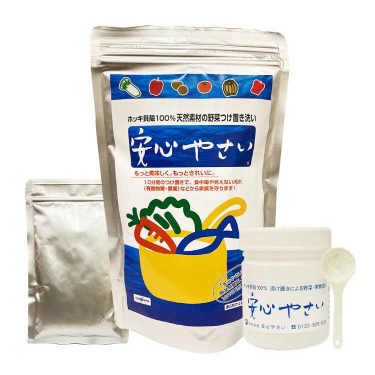 配送方法につきまして下記の配送方法をご利用いただけます。ご購入お手続き画面にてお選びください。宅配便送料の割引沖縄を除き送料無料です出荷日からの通常のお届け日数本州エリアは翌日お届け方法主に宅急便お受取り方法受取時のご捺印が必要になりますポストに投函される場合がございます宅配ボックスのご指定可能です日時指定〇 製品表記詳細 商品区分 食品添加物・貝殻焼成カルシウム(CaO ) 製造国 日本 製造者 安心やさい株式会社 販売者 安心やさい株式会社 原材料名 天然カルシウム98.89%,Na0.41%,Sr0.39% 広告文責 シンプリス株式会社 075-741-6843らくてんいがいでひょうじされているばあいはさぎさいとですごちゅういください ふりがな あんしんやさい キーワード サーフセラ ay300 ご注文情報 決済手数料 10000円未満のご注文で代金引換の場合324円の代引手数料がかかります。 銀行振込の場合は、ご利用銀行の振込手数料が必要です。 その他のお支払方法では手数料無料です。 お支払方法 ・代金引換(一部地域、商品は不可) ・クレジットカード ・コンビニ後払い(ご利用金額5万円まで) ・楽天バンク・銀行振込・ペイジー・Paypal(ご入金確認後の発送となります。) 返品・交換 返品(返金・交換)について ラインナップ安心やさい 300g6,600円(税込)商品詳細ページへ安心やさい 箱タイプ 1g 25包 4箱セット4,309円(税込)ポイント3倍商品詳細ページへご家庭でかんたんに農薬軽減!ホッキ貝殻から生まれた世界初の天然除菌剤除菌剤「安心やさい」は、食材の農薬などを軽減し、汚染物質からご家族みなさんの健康を守ります。自宅でかんたんに美味しく安心・安全食材に変えてくれる主婦の強い味方です。無味無臭!100%天然素材の除菌剤「安心やさい」は、貝殻の中でも特に抗菌効果のあるホッキ貝を主原料とした天然素材100%の除菌洗浄剤。薬品・化学処理・添加物などは一切使用しておりません。水に溶かして、野菜や果物を浸けておくだけで、食材についた雑菌を除去し、農薬を軽減し、鮮度を落とすことなく、より安全に食材を食べることができます。「安心やさい」の特徴天然素材100%だから安心・安全!大腸菌(O−157)を除去、農薬を軽減食材の日持ちが良くなります!食材本来のうまみ・味がアップします!環境を汚しません「安心やさい」3つのポイント1.天然素材100%だから安全・安心!従来の次亜塩素酸を使った除菌では、塩素が水の有機物と反応して悪影響を及ぼす有機塩素化合物トリハロメタンなどが生成されてしまいます。「安心やさい」は天然素材100%ですから悪影響を及ぼすことはありません。2.農薬を軽減「安心やさい」を水に溶かしたときに生じる強アルカリ性の洗浄力により、一般生菌・カビ菌・食中毒の原因菌などを軽減します。問題となっている食材に付着している農薬・ワックス・防腐剤・着色料などの添加物や、フタン酸エステル類なども軽減します。3.天然素材ホッキ貝の強い抗菌効果貝殻粉末には、除菌効果があることは以前から知られていましたが、ホッキ貝殻の焼成粉末には、カキ貝殻の20倍以上の強い抗菌効果があることが発見されました。その後、研究・開発が繰り返され、特殊焼成法(特許取得2003年4月18日)により誕生しました。除菌だけではない!さらにうれしい効果食材が長持ちします!マイナスイオンやミネラルによる抗菌コーティング効果が働き、食材の日持ちが向上します。食材本来の美味しさに食品に付着している悪影響のある物質を取り除くことで、食品本来の美味しさを引き出します。環境に良い使用後の溶液は、排水溝の雑菌を取り除きます。100%天然素材ですから環境を汚しません。洗浄の仕組み中性の水道水を強アルカリ水に変えます。安心やさいのご使用方法1.調理直前に水洗いします。(食材を刻んでから洗浄すると、表面の汚れが取れやすくなります)2.水2リットルに本品(1包)を溶かし、食材を5〜10分漬け置きします。(強アルカリ溶液ができます)3.汚染物質が溶け出し、水が濁ってきたら、ざるで水を切ります。4.水切り後、ポリ袋に入れて冷蔵保存してください。繰り返し使えますので、スーパーのポリ袋2つ分位のまとめ洗いが可能です。安心やさい溶液の水切り後、水洗いをして白い粉(カルシウム)を流してしまうと、保存効果が弱まります。日持ちさせるため、調理直前に食材を水洗いしていただくことをおすすめします。安心やさい ご使用上の注意溶液は時間が経つと劣化します。24時間以内にお使いください。本品は食品添加物ですが、食べ物ではありません。湿気厳禁。固まると効果がなくなります。本品が目の粘膜に付着した際は、多量の水で洗い流してください。皮膚の弱い方、高濃度洗浄される際は、手袋をご着用ください。様々なものを除菌できます!調理器具の除菌方法たっぷりの安心やさい溶液に、まな板・包丁・食器・ふきんなどを浸けて10分間置きます。浸け置きした後、水洗いせず、そのまま置きます。お米の除菌方法お米を洗う前に、安心や