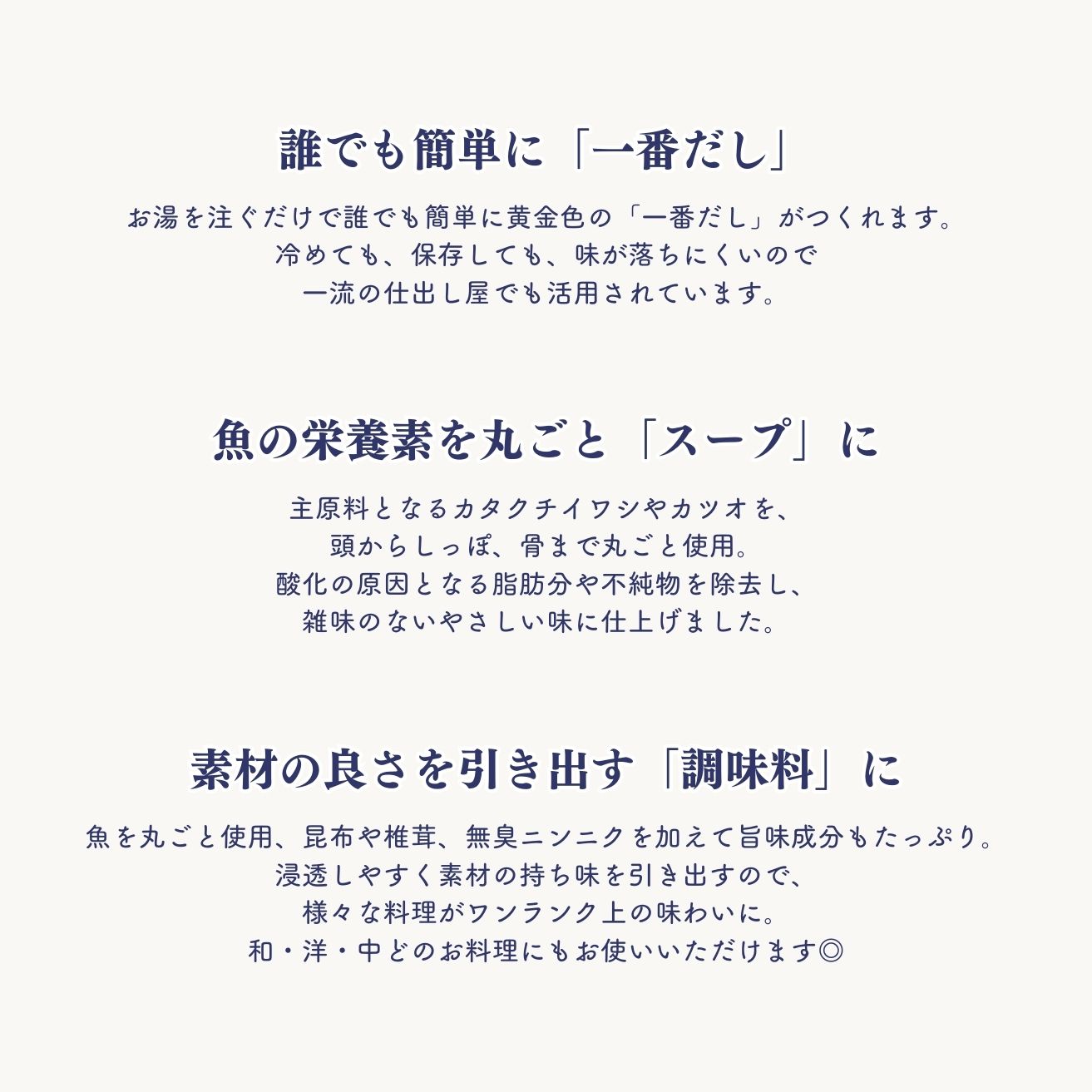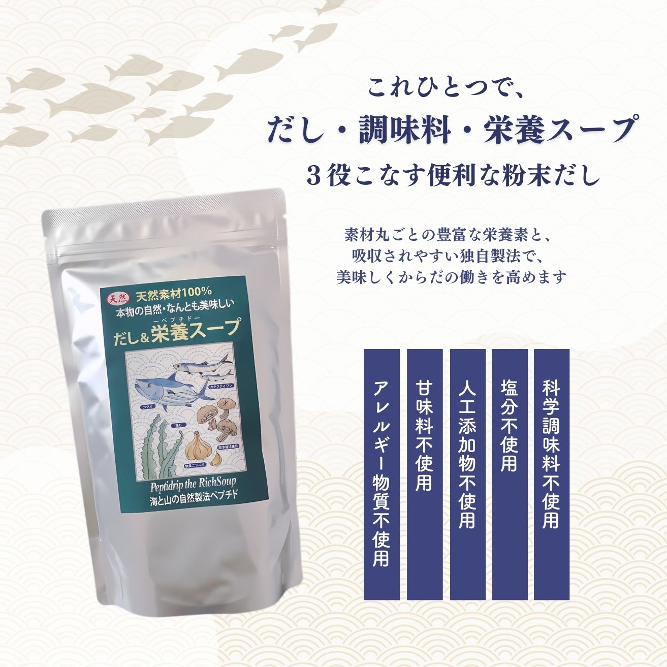 配送方法につきまして下記の配送方法をご利用いただけます。ご購入お手続き画面にてお選びください。小型宅配便宅配便送料の割引送料無料です送料無料です出荷日からの通常のお届け日数本州エリアは翌日本州エリアは翌日お届け方法主にネコポス・クリックポスト・宅急便・レターパック主にネコポス・クリックポスト・宅急便・レターパックお受取り方法受取時のご捺印が必要になりますポストに投函される場合がございます宅配ボックス不可です受取時のご捺印が必要になりますポストに投函される場合がございます宅配ボックスのご指定可能です日時指定×〇 一流仕出し屋の味 「だし」や「スープ」として手軽に使える粉末和風だしです。味浸みも良く、素材の味を引き出し、お料理の腕を上げてくれます。おいしいだけでなく、魚を丸ごと使っているので、栄養満点! お湯と塩を加えるだけでできる「スープ」で、簡単に豊富な栄養を補給できます。 「だし 栄養スープ 500g」の5袋セットです。 だし 栄養スープって? 製品表記詳細 商品区分 食品 製造者 千年前の食品舎 原材料名 でんぷん分解物(キャッサバ芋・タイ)、カタクチイワシ(福岡・長崎県近海)、 カツオ(鹿児島県近海)、昆布(北海道)、原木栽培椎茸(大分県)、無臭ニンニク(山口県) 広告文責 シンプリス株式会社 075-741-6843らくてんいがいでひょうじされているばあいはさぎさいとですごちゅういください ふりがな だしえいようすーぷ キーワード CH054 スープ だし テストキーワード des500p5 ご注文情報 決済手数料 代金引換を含む何れの決済方法でも手数料は無料です。 銀行振込の場合は、ご利用銀行の振込手数料が必要です。 お支払方法 ・代金引換(一部地域、商品は不可) ・クレジットカード ・コンビニ後払い(ご利用金額5万円まで) ・楽天バンク・銀行振込・ペイジー・Paypal(ご入金確認後の発送となります。) 返品・交換 返品(返金・交換)について ラインナップだし栄養スープ 500g3,375円(税込)商品詳細ページへだし 栄養スープ 500g 5袋セット「だし 栄養スープ 500g」の5袋セットです。16,875円(税込)商品詳細ページへだし栄養スープ お試し10g 6包0円(税込)翌日配送「あす楽」対応商品詳細ページへだし 栄養スープのご使用方法・栄養スープ:1回分大さじ山盛り1杯(約10g)にお好みで適量の天日塩やコショウ、ネギ、梅干、わかめ等を加えて熱湯を注いでください。食欲がないときや運動後の体力補強、赤ちゃんからお年寄りまでの栄養補給源としてお使いいただけます。・だし:1人前5〜10gを目安に水またはお湯で溶いてご使用ください。澄み切った黄金色の「一番だし」が手軽につくれます。味噌汁やうどん、そばなどの和食はもちろん、フレンチやイタリアンの煮込み料理、中華のラーメンや炒め物など、さまざまな料理のベースにお使いいただけます。※塩が入っていないため、お好みに合わせて塩や醤油を加えてお召し上がりください。・調味料粉のままうま味のある「調味料」としてお使いいただけます。とても細かい分子のため浸透しやすく、素材の味を引き立てます。炒め物の最中に、また出来上がった量に振りかけても旨みが加わります。ほかにも天つゆ、めんつゆ、炊き込みご飯などは、多めに入れると美味しくできます。お好み焼き、チヂミなどは、生地に混ぜると旨みアップ!塩と一緒に揉み込むと、短時間でもおいしい浅漬けが出来ます。魚は焼く前に振りかけると、独特のニオイがおされられます。だしの素一流仕出し屋の味だし 栄養スープ万能だしだし亭や かつおだし国内産野菜使用野菜のおかげリプリ だし 栄養スープ 1 だし 栄養スープ リプリ だしの素 7 だし 栄養スープ