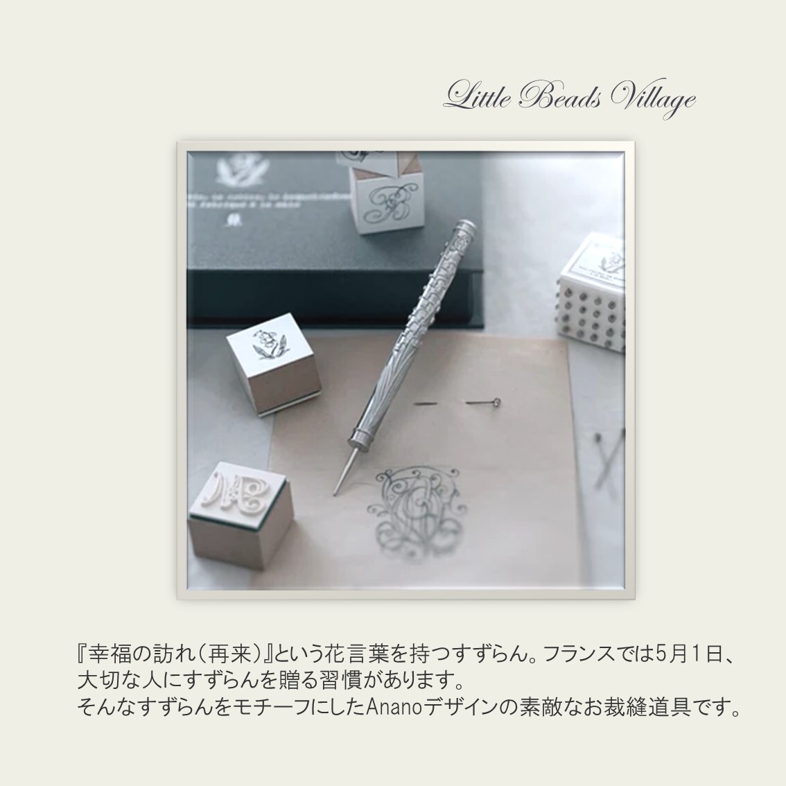 商品情報素材/材質柄部:錫100%筆先:鋼(ニッケルメッキ)サイズ/寸法<本体サイズ>全長:約120mm、先端:約20mm<パッケージサイズ>143X92X26mm(重量:約73g)ご注意モニターの発色具合により実際のものと色合いが異なる場合があります。【楽天ランキング1位受賞!!】クロバー トレーサー ポルトボヌール すずらん 79-980 スズラン プレゼント 自分 ご褒美 贈り物 可愛い 手芸用品 手芸道具 刺繍 図案 トレース ハンドメイド 道具 母の日 クリスマス 自分 ご褒美 誕生日 ハンドメイド 道具 素敵 クロバーのポルトボヌールシリーズ。人気雑貨アーティストAnano(溝江里映)によるすずらん模様が清楚なデザインのトレーサー。刺繍、図案 *ポルトボヌール、すずらんキャンペーン開催中!シリーズ新商品「なめらか目打」の発売に際しまして、ポルトボヌール・シリーズ商品を5,000円以上お買い上げのお客様にノベルティー(ポルトボヌール柄オリジナルマスキングテープ、非売品)をプレゼント!*数量に達し次第、キャンペーンのプレゼントは予告なく終了いたします。ご了承くださいませ。『幸福の訪れ(再来)』という花言葉を持つすずらん。フランスでは5月1日、大切な人にすずらんを贈る習慣があります。そんなすずらんをモチーフにしたAnanoデザインの素敵な高級感のあるトレーサーです。刺繍の図案を写すとき、きれいに描けるトレーサーです。柄部は錫でできいます。豊かな特別なハンドメイドのお時間を。・溝江里映デザインのきれいなパッケージでお届けいたします。 プレゼントやノベルティにピッタリです。大切な方への贈り物、そして、ご自分へのご褒美に。*2025年6/2より店頭販売価格を改定しております。恐れ入りますが、ご了承くださいませ。 2