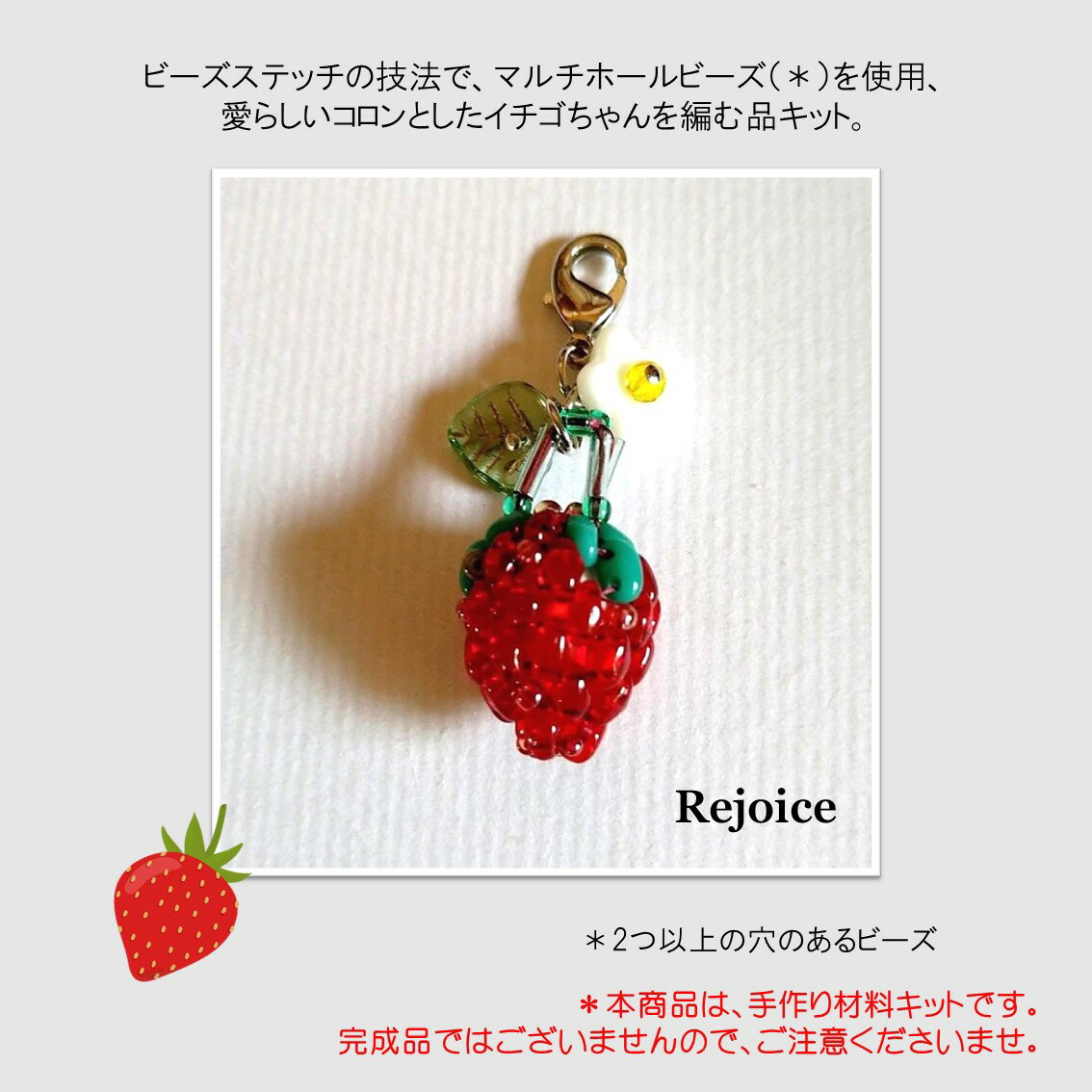 商品情報製作レベル難易度:★★☆☆☆(初級)ビーズステッチご経験者の方向け技法マルチホールビーズ(*)を使ったビーズステッチ(*)一つのビーズに2つ以上の穴があるビーズ材料マルチホールビーズ(*)、丸小ビーズ、特小ビーズ、チェコビーズ、Tピン、丸カン、カニカン、モチーフの中に入れる素材(*)一つのビーズに2つ以上の穴があるビーズ*糸の封入はありません。ご用意頂くものビーズ針10号、ビーズステッチ(*ナイロン)糸 赤もしくは、ピンク *MIYUKI、または、OneG(トーホー)はさみ、ニッパー、平ペンチ、丸ペンチサイズ/寸法全長:約3センチご注意ビーズは汗や摩擦により色が剥げ落ちるなどのトラブルが起こる場合があります。取り扱いにご注意ください。モニターの発色具合により実際のものと色合いが異なる場合があります。デザイナー☆デザイナー: 佐々木 明美~Rejoice~ H.28.12~H30.8 クラフトパーツIMA(光が丘)にてビーズアクセサリー講師 H.29.4~R.2.3 パーツクラブ(ららぽーと富士見店)にてビーズアクセサリー講師 R.3.12~R4.8 手芸センタードリーム(高島平)にてミニチュアクラフト講師 楽習フォーラムにて各種の基本技法を学びつつ、マルチホールビーズ等パズルのように組み合わせたオリジナル製作にトライしています。【7月新入荷!】改訂版イチゴチャーム~赤Ver.~/ビーズアクセサリーキット ビーズチャーム チャーム ビーズステッチ パーツ ハンドメイド アクセサリー キット 手作りアクセサリー 手作りキット 大人 イチゴ いちご 可愛い 苺 リトルビーズビレッジ ビーズステッチの技法で、マルチホールビーズを使って作る可愛らしいいちごのチャーム。使い方は工夫次第で。佐々木明美Rejoice先生オリジナルデザイン。 佐々木明美Rejoice(リジョイス)先生 のオリジナル・ビーズステッチ・アクセサリーキット。モチーフキット。*こちらは完成品ではありません。お客様にお作り頂くためのハンドメイド用のレシピ付き材料キットです。*こちらチャームキットは、糸の封入がありません。ご用意下さい(*)2つ穴以上のマルチホールビーズを使用して、作るビーズステッチキットです。コロンとしたとっても可愛らしいいちごのフォルムが魅力的です。キットには、いちご1コ分等の材料と、丸カン、カニカンを封入。お手持ちのチェーンと合わせて、ペンダントヘッドに、2キットご購入の上、こちらもお手持ちのイヤリング金具やピアス金具を用いて、イヤリングやピアスにも。 〜デザイン〜佐々木明美先生 Rejoice(リジョイス)愛らしいイチゴちゃんのふっくらコロリンとしたフォルムやみずみずしさを共感して頂けると嬉しいです。チャームや金具を替えイヤリング、まとめてチェーンを通しネックレス等アレンジを加え楽しんで頂き…、ちょっとしたプレゼントにもオススメです!針と糸を使用する(ビーズステッチ)の技法でマルチホール(2穴以上)ビーズ、初めての方にもチャレンジしやすいと思います。写真付きのレシピや図解でわかりやすくを心がけて作っておりますが、ご不明な点等がございましたら、デザイナーまでお気軽にお問合せ下さいませ(キット表紙や内に連絡先がございます)。*すぐにご回答できない場合もございます。ご了承下さい。(*)「封入あり」と記載がありましたが、実際は封入はございません。お詫びして訂正致します 2