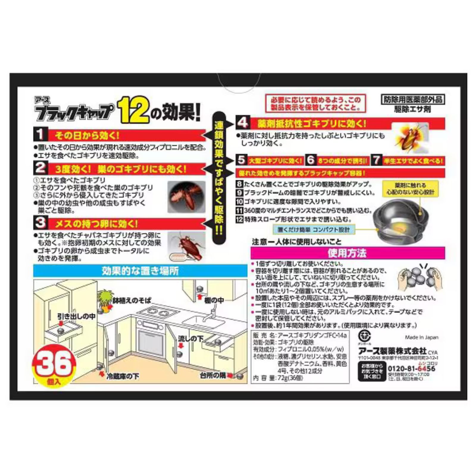 ブラックキャップ 大容量 ゴキブリ駆除剤 置き型(36コ入) 置いたその日から約1年間効く、ゴキブリ駆除エサ剤 【特徴】・置いたその日から効果が現れる速効成分フィプロニルを配合。・餌を食べたゴキブリを速攻退治。・餌を食べたチャバネゴキブリが持つ卵にも効く。・ゴキブリの卵から成虫までトータルに効きめを発揮。・薬剤に対し抵抗力を持ったしぶといゴキブリにもしっかり効く。【効能・効果】・もちろん大型ゴキブリも速攻退治。どんなゴキブリにも効く。・餌を食べたゴキブリはもちろん、そのゴキブリのフンや死骸を食べたゴキブリも駆除。・巣の中の幼虫や他の成虫もすばやく巣ごと退治。・ブラックドームの暗闇と、適度な隙間でゴキブリが警戒しにくい。【商品説明】・マルチエントランス容器が360度どこからでも誘い込む。・たくさん置くことでゴキブリの殺虫効果がアップ。【商品仕様】・一度に1袋(12個)全部お使いいただくとより効果的です。【使用方法】・1個ずつ切り離してお使いください。・容器を切り離す際には、容器が割れることがあるので、丸い面を上にして、ていねいに割り取ってください。・台所の隅や流しの下など、ゴキブリの生息する場所に5平方メートルあたり2~4個置いてください。 5