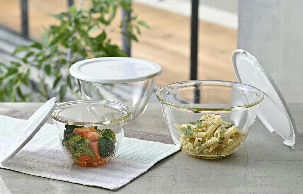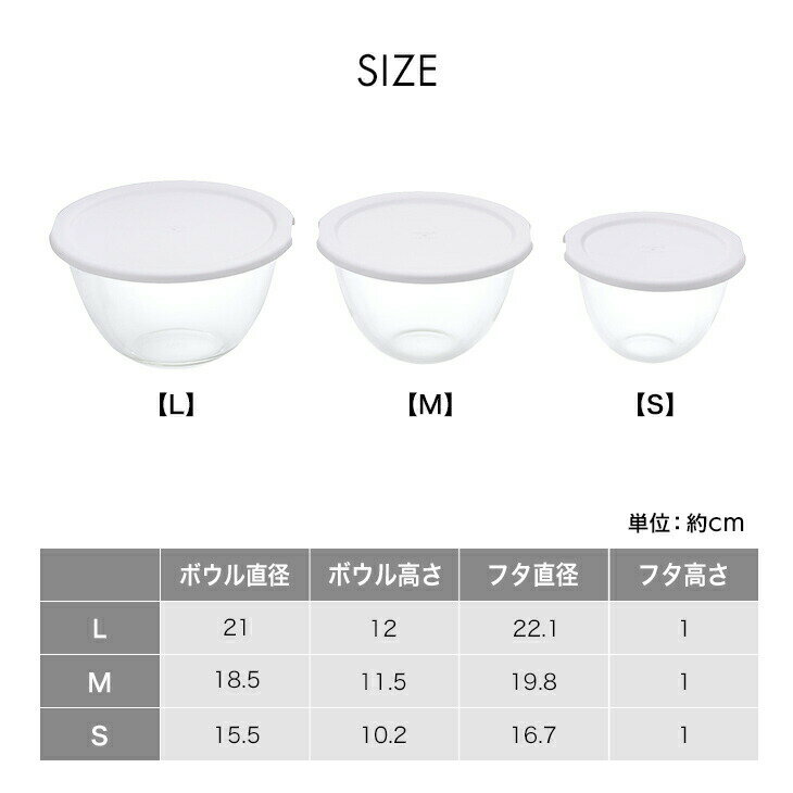 耐熱ガラス製ボウルにフタができて使い方UP!フタの両側に水切り口付きで、お米やパスタなど食材も水切りできます。耐熱ガラスなので、ボウルにフタをセットして電子レンジOK。ラップ不要で調理・下ごしらえ・保存ができ、食器としてもお使いいただけます。フタをしたままレンジ・積み重ねOK。 ●サイズ/S:ボウル径約15.5×高さ約10.2cm、フタ径約16.7×高さ約1cm、M:ボウル径約18.5×高さ約11.5cm、フタ径約19.8×高さ約1cm、L:ボウル径約21×高さ約12cm、フタ径約22.1×高さ約1cm ●重さ/S:約525g、M:約785g、L:約890g ●容量/S:約900mL、M:約1500mL、L:約2200mL ●素材/ボウル:耐熱ガラス、フタ:ポリプロピレン ●備考/ボウル:耐熱温度差120度、フタ:耐熱温度140度 ●製造国/日本製