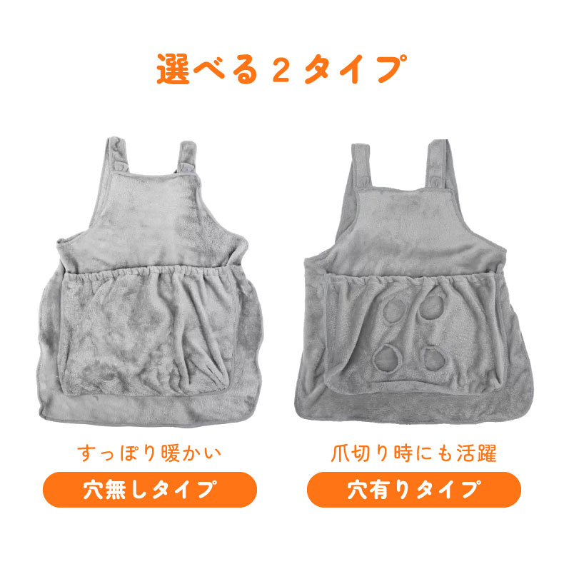 商品詳細 ペットと一緒にくつろげるエプロン毛布 ご家庭の猫ちゃんワンちゃんと最高のリラックスタイムを過ごせます 穴有りタイプは、爪切り時にも大活躍! 是非一度試してみてください♪ 種類 ・穴無しタイプ ・穴有りタイプ 全体サイズ 長さ:74cm 横幅:65cm ※詳しくは画像をご確認ください 耐荷重 長さ:74cm 横幅:65cm ※スナップボタンを3つ全て止めた場合です ※安全のため、立って使用する際は必ず確認してから手を離すようにしてください。 ※基本は座ってのご利用を推奨しております。 備考 ※お客様おモニター環境などによって色味が若干異なる場合がございます。 ※多少の個体差がございますが初期不良ではございません。 ※入荷時期によって色味、デザインが多少異なる場合がございます。 ※本製品は品質向上の為、予告なくデザインを変更する事がございます。予めご了承ください。