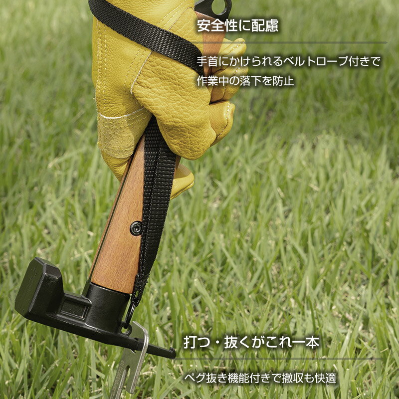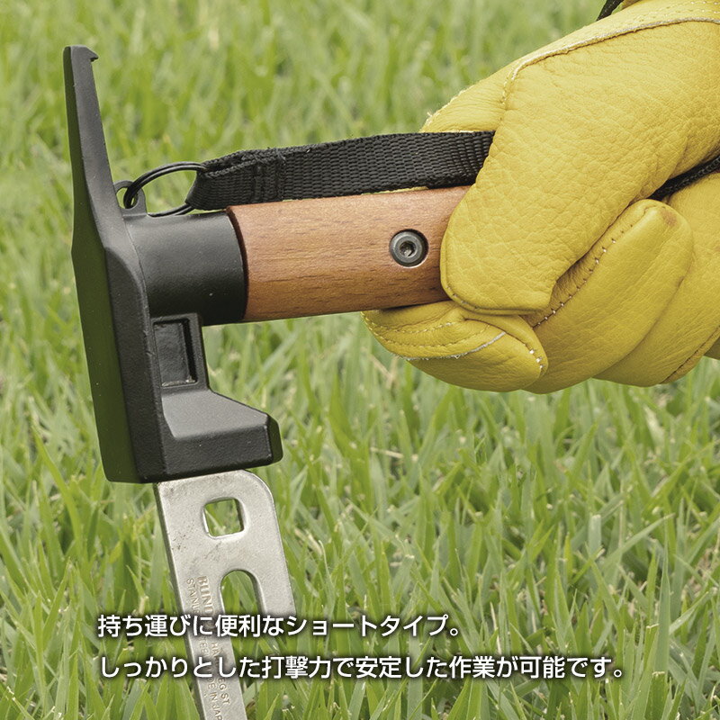 コンパクト&多機能、ショートタイプ ペグハンマー(ペグ抜き&ベルト付き)タープやテント設営の必需品。扱いやすいショートタイプのペグハンマー。打ち込みも抜き取りもこれ一本で対応。軽量&コンパクトで持ち運びに便利、キャンプやアウトドア初心者にもおすすめです。■ショートタイプで携帯ラクラク収納しやすく、持ち運びのストレスを軽減。■ペグ抜き機能付き打つだけでなく、抜く作業もスムーズ。撤収時の効率アップ。■滑りにくいベルトロープ付き作業中の落下防止&安心感。吊り下げ収納も可能。■しっかり打ち込める頑丈ヘッドアルミ・スチール・プラペグにも対応。商品名ペグハンマー ショートブランド・メーカーBUNDOK(バンドック)製造国中国材質金属部/スチール(塗装)ハンドル/天然木商品サイズ(約)105×30×220mm重量(約)490g商品仕様ベルト付注意事項※本製品は野外レジャー用に収納性、携帯性を重視した製品です。常設及び日常使用など頻度の高いご使用は避けてください。※周囲の安全を確認してご使用ください。※固い地面でのご使用は破損やケガの原因となることがあります。※ペグ打ち・抜き以外の用途には使用しないでください。※小さなお子様の手の届かない場所で保管してください。