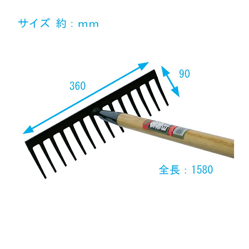 爪部はスチール製14本爪タイプです。清掃、整地作業に最適です。(用途)・除草後の集草作業。・うね上げ後のならし作業。・整地作業。(特徴)・頭部爪先に熱処理を施し靭性(粘り強さ)、耐磨耗性に優れています。・爪側を反転して整地レーキとしての使用も出来ます。・14本爪タイプ。(柄部手元形状)・丸型。(修理対応)・柄交換修理対応商品。全長:1580mm頭部先幅:360mm頭部高さ:90mm先爪板厚:4.5mm頭部爪数:14本頭部:スチール柄部:天然木重量:1.5kg製造国:日本JANコード:4960517072883 商品番号:72890