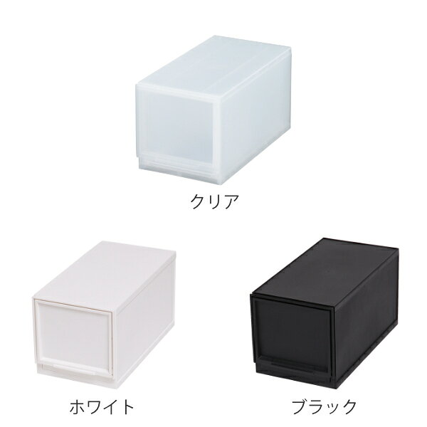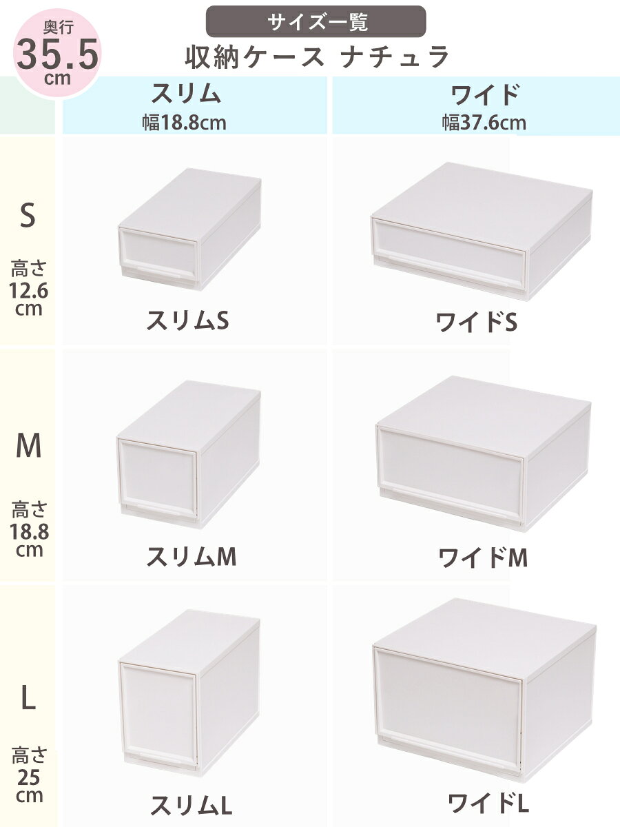 サイズ【スリム S】外寸:約 幅18.8×奥行35.5×高さ12.6(cm)内寸:約 幅14.3×奥行32.6×高さ8.1(cm)【ワイド S】外寸:約 幅37.6×奥行35.5×高さ12.6(cm)内寸:約 幅32.5×奥行32.3×高さ8.1(cm)【スリム M】外寸:約 幅18.8×奥行35.5×高さ18.8(cm)内寸:約 幅14.3×奥行32.6×高さ14.3(cm)【ワイド M】外寸:約 幅37.6×奥行35.5×高さ18.8(cm)内寸:約 幅32.5×奥行32.3×高さ14.3(cm)【スリム L】外寸:約 幅18.8×奥行35.5×高さ25(cm)内寸:約 幅14.3×奥行32.6×高さ20.5(cm)【ワイド L】外寸:約 幅37.6×奥行35.5×高さ25(cm)内寸:約 幅32.5×奥行32.3×高さ20.5(cm)内容量【単品】1個【2個セット】同色2個セット【3個セット】同色3個セット【4個セット】同色4個セット【5個セット】同色5個セット【6個セット】同色6個セット【8個セット】同色8個セット【10個セット】同色10個セット<付属品>【スリム】連結部品 1個、滑り止め 2個、仕切り板 1枚【ワイド】連結部品 1個、滑り止め 2個、仕切り板 2枚材質本体・仕切り板・連結部品:ポリプロピレン滑り止め:合成ゴム前面パネル:スチレン樹脂カラークリア、ホワイト、ブラック生産国日本製キャスターなし(別売り)スタッキング可能引き出し1段あたり耐荷重【スリム S】【ワイド S】【スリム M】【ワイド M】【スリム L】:3kg【ワイド L】:5kg天板耐荷重3kg区分返品・キャンセル区分(大型商品)収納ケース ナチュラ クリアモジュール 小物入れ商品ラインナップおすすめポイント重ねてもスキマができず美しい見た目サイズ違いを組み合わせてもスキマができません。デッドスペースにもピッタリ収まります。シンプルでスタイリッシュなデザインは置き場所を選ばず、リビングや寝室、サニタリーやキッチンなど家中でお使いいただけます。組み合わせて自分好みの収納に並べて重ねて自分好みにアレンジできる引き出しタイプの収納ケースです。リビングはもちろん、子ども部屋でお子さまの洋服やおもちゃを入れたり、洗面所でタオルや洗剤・シャンプーなどのストック入れにも最適です。多様なサイズ展開から、お部屋にあった自分スタイルの収納にカスタマイズできます。クリア/ホワイト/ブラックの3色展開透け感のあるクリア色、お部屋を清潔感のある印象にするホワイト、上質でシックな印象のブラックの3色展開です。クリア色はくもりガラスのようにふんわり透けて見えるので、中のものがひと目で分かるのが嬉しいポイントです。ホワイト、ブラックは透けないので、隠す収納としてお使いいただけます。ラインナップ詳細隙間収納にぴったりなスリムタイプ 幅18.8cm【スリムS】【スリムM】【スリムL】【スリムS】:高さ12.6cmカトラリーや文具、細長い物の収納に。デスク上やキッチンカウンター上でも活躍します。【スリムM】:高さ18.8cmキッチンカウンター上や洗面所での小物入れに。CDの収納にもピッタリです。CDの収納目安:約30枚【スリムL】高さ:25cmキッチンのストック収納や掃除用品入れに。DVDやゲームソフトの収納にもピッタリです。DVDの収納目安:約20枚身の回りの整理整頓に便利なワイドタイプ 幅37.6cm【ワイドS】【ワイドМ】【ワイドL】【ワイドS】高さ:12.6cm文具やキッチン小物など細かい物の整理に。デスク上やキッチンカウンター上でも活躍します。【ワイドМ】高さ:18.8cmハンカチや靴下など小物入れに。十字に仕切ってCDの収納にもピッタリです。CDの収納目安:約60枚【ワイドL】高さ:25cmタオルや衣類、食品ストックの収納に。十字に仕切ってDVDやゲームソフトの収納にもピッタリです。DVDの収納目安:約40枚小物の整理に便利な仕切り付き着脱可能な仕切りが付いています。中に入れるものに合わせて仕切りの位置を変えられるので便利です。【スリム】仕切り板が1枚付属しています。奥行方向に5ヶ所差し込み穴があり、 お好みの位置で仕切れます。【ワイド】仕切り板が2枚付属しています。幅・奥行を半分、または十字に仕切れます。共通詳細スキッと閉まる引き出しスルッと引き出せて、スキッと閉まる引き出しです。最後まで引き出しを押さなくてもきちっと閉まってくれるので、引き出しが閉まりきらず開けっ放しということもなくなります。引出しストッパー付き引き出しにはストッパーが付いているので、一番奥まで引き出しても落下する心配がありません。※すべて引き抜くことも可能です。前倒れ防止の連結部品付き前倒れ防止の連結部品が付いているので、積み重ねたケースの引き出しを使用する時も安心してご使用いただけます。底面滑り止め付き本体底に付属の滑り止めを装着することで、本体が安定します。別売りキャスターで移動も楽々別売りのキャスターをつければお掃除や衣替え時の移動も楽々です。キャスター使用時は、高さが約4cmアップとなります。取り付けも差し込むだけの簡単取り付けです。ご注意点※引き出しストッパーが付いているため、最後まで引き出せない仕様となっております。引き出しを引き出せる奥行は25.6cmまでとなっております。カラーサイズあわせて買いたい専用キャスター関連キ