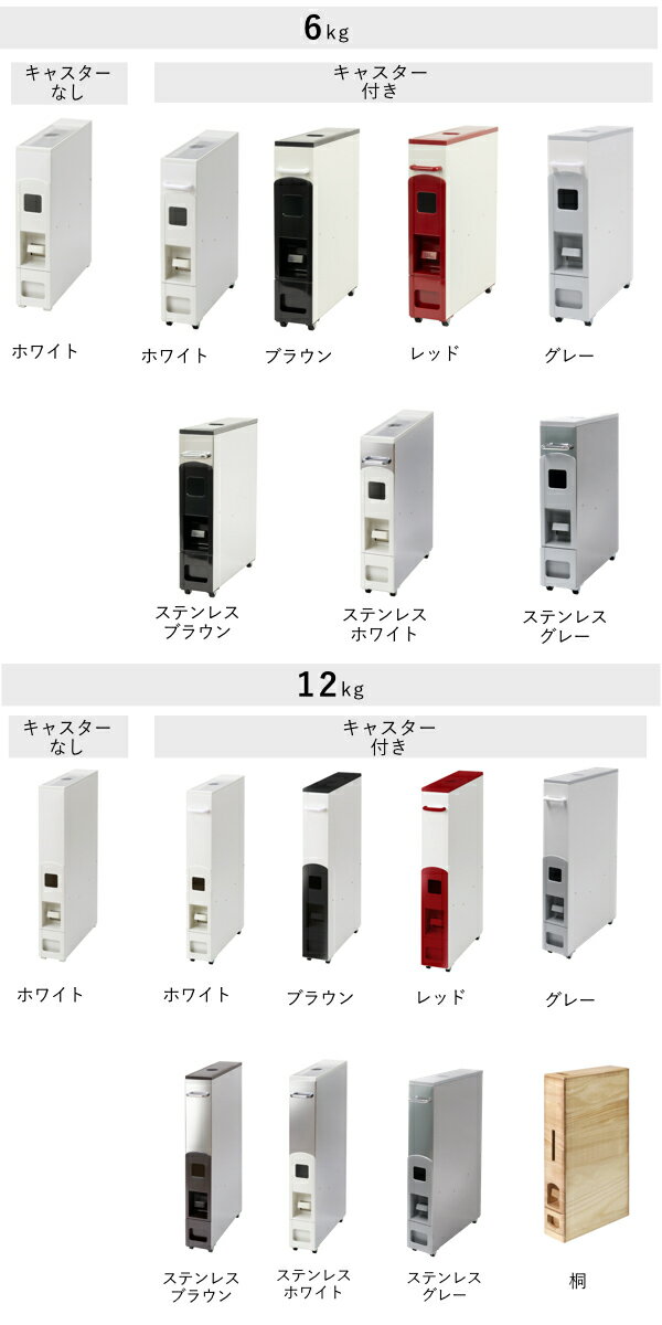 サイズ【6kg・キャスターなし(ホワイト)】約 幅10×奥行38.3×高さ46(cm)【6kg・キャスター付き(ホワイト・カラー・ステンレス・グレー・ステンレスグレー)】約 幅10×奥行40.6×高さ47.6(cm)※キャスター含む高さ:約 49.1(cm)【12kg・キャスターなし(ホワイト)】約 幅10×奥行41×高さ65.6(cm)【12kg・キャスター付き(ホワイト・カラー・ステンレス・グレー・ステンレスグレー)】約 幅10×奥行40.6×高さ67.1(cm)※キャスター含む高さ:約 68.6(cm)【12kg・キャスター付き(桐)】約 幅11.7×奥行39.7×高さ69.7(cm)重量【6kg・キャスターなし(ホワイト)】約 2kg【6kg・キャスター付き(ホワイト・カラー・ステンレス)】約 2.2kg【12kg・キャスターなし(ホワイト)】約 2.7kg【12kg・キャスター付き(ホワイト・カラー・ステンレス)】約 2.8kg【12kg・キャスター付き(桐)】約 3kg容量【6kg】米収納量:約6kg受皿容量:約4合計量方式:1合【12kg】米収納量:約12kg受皿容量:約4合計量方式:1合内容量1台材質【6kg/12kg・キャスターなし(ホワイト)】カラー鋼板【6kg/12kg・キャスター付き(ホワイト)】カラー鋼板【6kg/12kg・キャスター付き(カラー・ステンレス)】ステンレス鋼板【12kg・キャスター付き(カラー)】[ブラウン・レッド・グレー]カラー鋼板[ステンレスブラウン・ステンレスグレー]ステンレス鋼板【12kg・キャスター付き(桐)】本体・蓋・受皿:桐(水性ウレタン塗装)、残量窓板:PET樹脂、内部つまみ・計量器:ABS樹脂生産国韓国製生産国補足【12kg・キャスター付き(桐)】のみ日本製注意事項【12kg・キャスター付き(桐)】※ご購入後しばらくは表面の塗装により匂いが生じることがありますが、天日干しか風通しのよい場所に放置していただくことで軽減されていきます。備考※無洗米対応区分返品・キャンセル区分(小型商品)米びつ スリム ライスストッカー 6kg 12kg種類サイズあわせて買いたいスリム米びつ上の空間を活用キッチン隙間ラックホワイト×木天板木天板 すき間米びつ虫よけ忌避剤6ヶ月有効(10kgまでの米びつ用)虫よけ忌避剤1年間有効(35kgまでの米びつ用)関連キーワード:おしゃれ おすすめ 米櫃 ライスディスペンサー 5 10 5キロ用 10キロ用 6キロ 12キロ 6 12 5kg対応 10kg対応 一合計量 保管 長期 ストッカー ストック 米 コメ こめ ライス 計量できる はかれる 計れる 量れる 計測 残量確認 残量見える ワンプッシュ 先入先出方式 大容量受け皿 米ストッカー 米保存 コメビツ こめびつ シンプル オススメ キッチン収納 省スペース 場所を取らない どこでも置ける キッチン用品 台所用品 キッチングッズ 便利グッズ 小窓付き 10kg用 ホワイト ブラウン レッド ステンレス 桐 キャスター 残量 米びつケース 台所 キッチン 無洗米 1合 スタイリッシュ LH4476関連商品はこちら米びつ コンパクト ライスディスペンサー 6k7,280円~米びつ S計量米びつ 6kg 12kg 4,280円~米びつ 計量米びつ 10kg用 12kg 3,870円米びつ S計量米びつ 6kg 4,280円米びつ 計量米びつ 5kg用 6kg 3,510円 米びつ ライスエースS 6kg 12kg 8,780円~米びつ 1合計量 10kg用 無洗米対応 コン7,980円米びつ 1合計量 5kg用 無洗米対応 コンパ7,280円米びつ スリムエース 6kg 12kg キャス4,980円~ 米びつ ライスエースS 6kg 8,780円 米びつ 5kg用 スリムライスディスペンサー7,980円米びつ 防虫米びつ 10kg用 3,310円