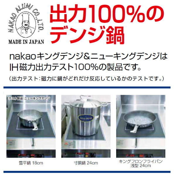 サイズ厚さ:約 0.2(cm)約 内径21×深さ9(cm)容量満水容量:3.7L内容量1個材質ステンレス生産国日本製熱源IH・ガス火両対応注意事項※ご家庭用は15~24cm位が最適なサイズです。最大でも27cmが目安です。※大きいサイズのものはコンロの大きさ、コンロ周りにも気を付けてください。区分返品・キャンセル区分(不可)ギフトラッピングページを見る●プロの高火力IHにも耐えるプロユースのヤットコ鍋です。●磁力の反応や耐久性に優れた445M2ステンレス材を使用しています。●板厚が均一で熱廻りが平均しているのでムラが無いです。●IH磁力出力テスト100%の製品です。●200VのIHなどあらゆる熱源に対応しています。おすすめポイント驚異の熱伝導率でプロも認めたIH対応ヤットコ鍋プロの高火力IHにも耐えるプロユースのヤットコ鍋です。磁力の反応や耐久性に優れた445M2ステンレス材を使用しています。別売りのヤットコバサミを使えば熱いままでも料理を運べます。素材の厚みなど業務用に設計されているので調理しやすいです。プロ仕様のシンプルな鍋はご家庭にも馴染みます。※こちらは内径21cm・容量約3.7Lの商品ページです。商品詳細素材にこだわり、IHでもパワーを発揮従来のステンレス鍋はIHなどでは強火にしても中火ほどの出力となり、ガス火ほどパワーを活かしきれていませんでした。しかし、キングデンジシリーズはIH電磁調理器向けに開発されており、特厚の単層ステンレス材で作られています。素材にこだわっているので出力100%が可能になりました。調理に便利な目盛り付きステンレス製なので手入れがしやすく、各サイズ入れ子にして収納が出来るので複数持ちでも場所を取りません。ボウルや鍋として使うことが出来るので、キャンプなどでも役立ちます。調理に便利な目盛り付きです。別売りのヤットコバサミでさらに快適に別売りのヤットコバサミはペンチのような形でしっかりと鍋を掴めます。持ち上げるだけではなく、傾けてお味噌汁などを注いだりすることも出来ます。持ち上げる時はハンドルが垂直になるので、調理中も邪魔にならず省スペースです。板厚によって長所が変わる中尾アルミの製品は鍋全体の厚さが均等になっているので、熱がムラ無く伝わるのが特徴です。加熱にムラが無いので、料理が苦手な方でも上手に火を通せます。・板厚が薄い:火が伝わるのに時間がかからず水も早く沸くので、下茹でやお味噌汁作りに向いています。・板厚が厚い:強度があり焦げにくくなるので、煮込み料理などじっくり熱を加える料理にオススメです。※一般的にはフライパン・鍋の厚みは1~2mm程度の物が多く、同社製品では1.2mm程度から5mmの物まで様々な厚みがございます。ステンレス:サビに強くお手入れしやすいアルミなどと比べて熱の伝わり方はにぶいですが、その分保温性があります。耐食性もありサビに強くお手入れがしやすいです。表面が固いので汚れがつきにくく、汚れても比較的落としやすいのが特徴です。また、酢・酸・アルカリ性のあるものや、塩分濃度の高いものの調理や保存に向いています。ご注意点ご家庭向けにご購入をお考えの方へご家庭用は15~24cm位が最適なサイズです。最大でも27cmが目安です。サイズは大きすぎても小さすぎても使いづらくなりますので、作る量に合わせてお選びください。大きいサイズのものはコンロの大きさ、コンロ周りのスペースにもお気を付けください。また、50cmを超えるサイズの寸胴鍋などは、設置場所までの扉や通路などでつかえてしまう場合もありますのでお気を付けください。ブランド紹介板厚が均一中尾アルミの製品は、鍋全体の厚さが均等。熱がムラ無く伝わるので、料理が苦手な方でも上手に火を通せます。一般的なフライパンや鍋の厚みは1~2mm程度。そんな中、中尾アルミの製品は1.2mmから5mmまで、様々な厚みの商品があります。永く使える中尾アルミの製品は、鍋全体の厚さが均等。シェフたちの厨房では、一般家庭とは比べ物にならない頻度、火加減で調理が行われています。シェフたちが永く使えるよう、アルミの加工時やコーティング時、ひとつひとつの作業に「長持ち」を意識した工夫が施されています。日本中のホテルやレストランで、何世代にもわたって愛され続けています。対応しているパーツ・オプションヤットコバサミサイズ違いヤットコ鍋 15cmヤットコ鍋 18cmヤットコ鍋 21cmヤットコ鍋 24cmヤットコ鍋 27cm関連キーワード:国産 万能鍋 ボウル ステンレスボウル 3.7リットル 調理用品 調理雑貨 調理器具 厨房用品 厨房 キッチン用品 台所用品 下ごしらえ用品 キッチンツール ガスOK IHOK ガス対応 ガスコンロ対応 ガス火 おすすめ オススメ 錆びに強い お手入れしやすい 母の日 父の日 プレゼント ギフト 贈り物 パーティ パーティー イベント キャンプ 便利 役立つ 家庭用 シルバー LH6293