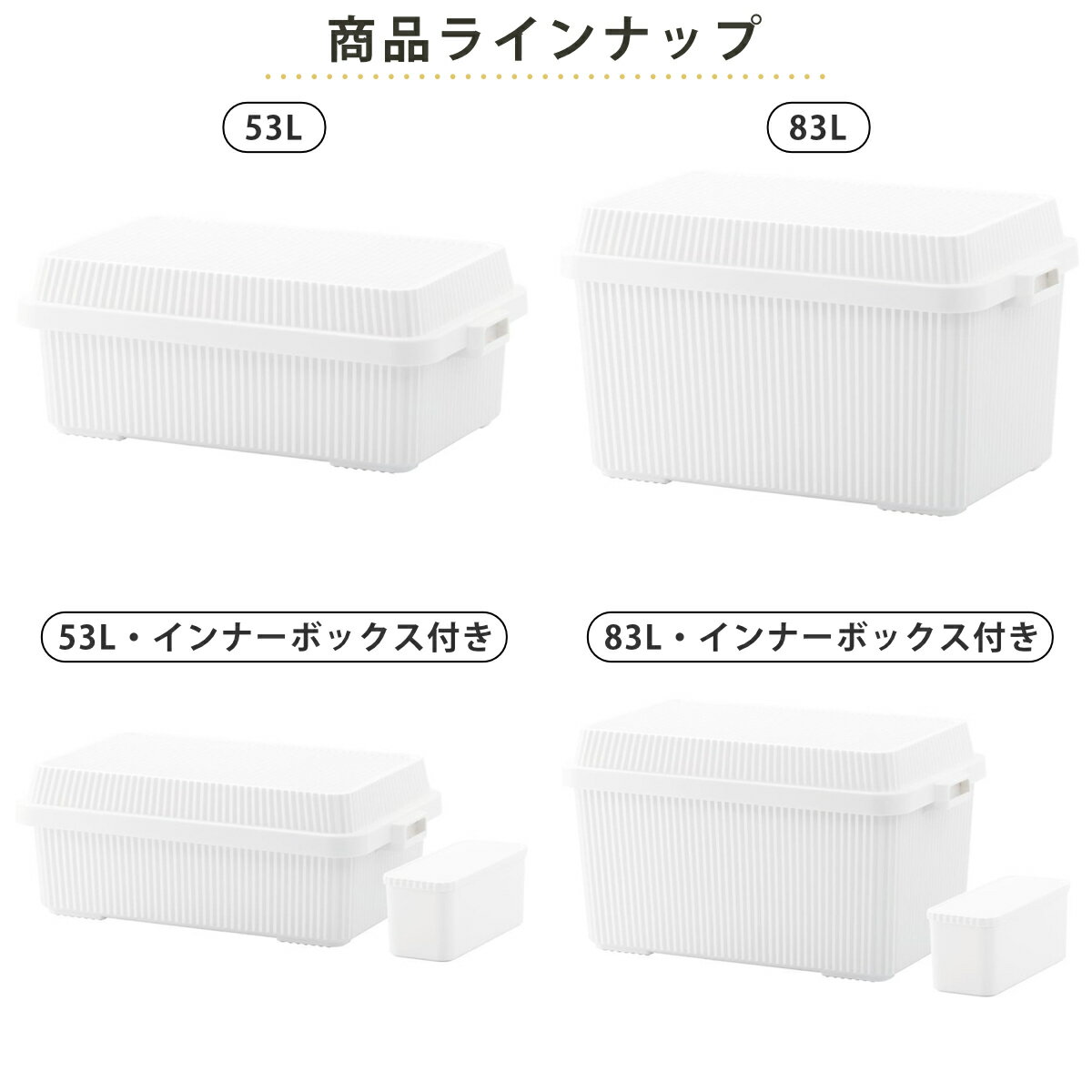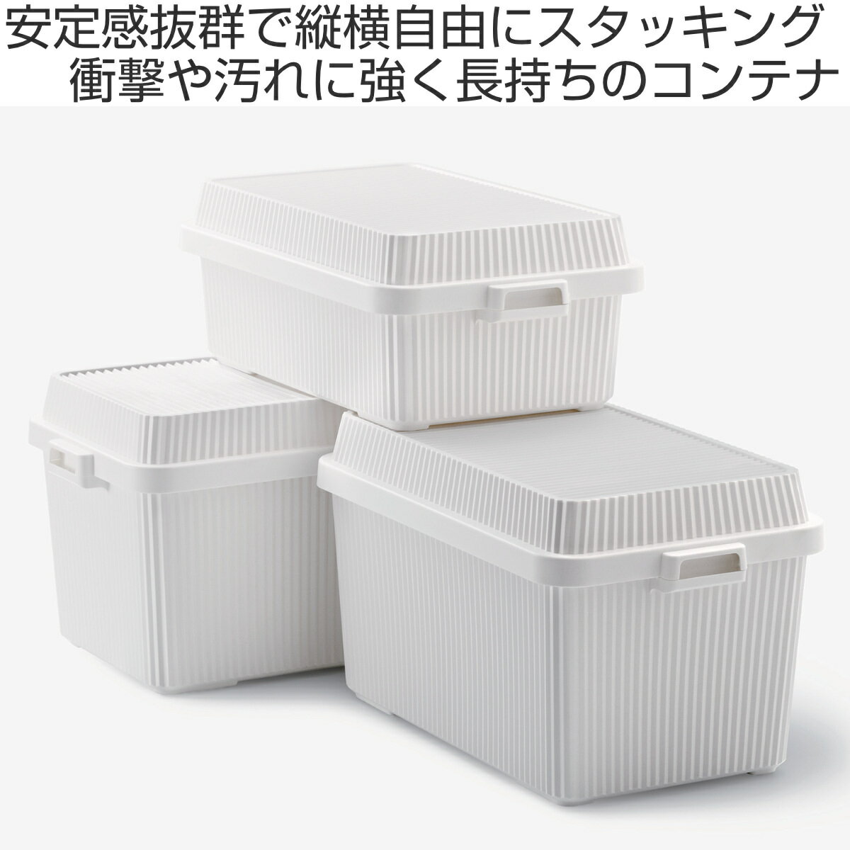サイズ【53L・インナーボックス無し】約 幅70.7×奥行42.2×高さ26.8(cm)(ハンドル含む)【83L・インナーボックス無し】約 幅70.7×奥行42.2×高さ40(cm)(ハンドル含む)【53L・インナーボックス付き】約 幅70.7×奥行42.2×高さ26.8(cm)(ハンドル含む)【83L・インナーボックス付き】約 幅70.7×奥行42.2×高さ40(cm)(ハンドル含む)容量【53L・インナーボックス無し】約 50L蓋取り付け時の容量:53L【83L・インナーボックス無し】約 70L蓋取り付け時の容量:83L【53L・インナーボックス付き】<コンテナー>本体容量:50L蓋取り付け時の容量:53L<インナーボックス>容量:6L【83L・インナーボックス付き】<コンテナー>本体容量:70L蓋取り付け時の容量:83L<インナーボックス>容量:6L内容量【53L・インナーボックス無し】1個【83L・インナーボックス無し】1個【53L・インナーボックス付き】1個(コンテナー1個、インナーボックス1個)【83L・インナーボックス付き】1個(コンテナー1個、インナーボックス1個)材質ポリプロピレンカラーホワイト、ベージュ、グリーン、ブラック、グレー生産国日本製スタッキング可能耐荷重100kg注意事項※商品ページ内には別の商品を含む画像を使用しています区分返品・キャンセル区分(小型商品)コンテナボックス 53L・83L スタックアップコンテナーおすすめポイント多目的に活躍する、強度抜群のコンテナージグザグに連結させた構造体を採用した、頑丈なコンテナーです。しっかりとした耐久性があるため、おうちで備蓄や衣類を積み重ねて収納できる他に、屋外の収納や車のルーフキャリアにもでも活躍します。衝撃や汚れに強く『タフ』な耐久性衝撃に優れた樹脂を使用し、アウトドアにも使える高い耐久性があります。安心の日本製で水に濡れたり汚れたりしてもサッと拭くだけでお手入れできるので、長くお使いいただけます。積み重ねてもしっかり安定 凸形状がフィットしてズレない空間に合わせて、複数個を縦横自由にスタッキングできます。蓋の外周部の凸形状が本体とフィットしズレ防止の役割を果たします。積み重ねても安定感抜群で、クローゼットの収納にもオススメです。■積み重ねた高さ 組み合わせ例・53L×2個:高さ53.5cm・53L×3個:高さ80cm・53L+83L:高さ66.5cm・83L×2個:高さ80cm噛み合う『インナーボックス』で生活にもフィット専用インナーボックスとコンテナのジグザグがぴったり噛み合うデザインです。インナーボックスが中でズレにくく、コンテナー内を仕切ることもできます。※深型83Lには、インナーボックスが2段積み重ねて、最大8個収まります。おもちゃの収納から防災、備蓄まで幅広く使える『分けられる&出しやすい』ボックスインナーボックスで仕切る事で、よりスッキリ収納できます。パーツの多いおもちゃも、それぞれ分ける事でお子様の片付けの習慣がつきます。インナーボックスごとに取り出せるので、次に使う時も種類ごとに直ぐに使えます。また、万が一の災害に備えて防災グッズや備蓄をまとめて収納するのにもオススメです。商品詳細椅子としても安心して使える耐荷重100kg本体は軽くて丈夫な素材で、女性でも簡単に持ち運べます。軽量ながら100kgの耐荷重なので、簡易の椅子として使う、重たい荷物を上に乗せる、ガーデニングの砂利を片づけるなど、様々なシーンで活躍します。※踏み台としてはご利用いただけません。開閉しやすいロック付きのフタ蓋を押し込むとロックがかかり、フタの片側を上に持ち上げることで簡単に開閉できます。水抜き穴と掴みやすいハンドル取っ手に水抜きの穴がありますので、水が溜まるのを防げます。ハンドル部分に丸みを持たせることで指がかかりやすく持ちやすいです。※持ち運びの際は本体部分の取っ手をお持ちください。カラーサイズ対応しているパーツ・オプション専用インナーボックス専用シリコンパッド関連キーワード:約 幅70.7cm×奥行42.2cm×高さ26.8cm 幅70cm 奥行40cm 高さ27cm スタッキング 積み重ね 可能 可 大 50リットル たくさん入る イス 椅子 いす 頑丈 ベランダ ベランダストッカー ストッカー ふた付き ふた フタ 蓋 付き 収納箱 キャンプグッズ キャンプ用品 アウトドア用品 アウトドアグッズ 野外 丈夫 収納box box プラスチック おしゃれ コンテナ関連商品はこちらコンテナボックス 53L 浅型 スタックアップ5,830円 コンテナボックス 53L 浅型 インナーボッ6,930円 収納ボックス 83L 深型 インナーボックス7,920円インナーボックス6 スタックアップコンテナー専1,210円収納ボックス トランクカーゴ LOW 頑丈箱 3,870円~収納ケース SPV コンテナ 45 日本製 4,030円収納ボックス トランクカーゴ 頑丈箱 日本製 3,050円~収納ボックス 68L ホームボックス 620 2,980円収納ケース SPV コンテナ 22 日本製 3,310円収納ケース SPV コンテナ 25 日本製 2,900円収納ケース SPV コンテナ 13 日本製 2,280円収納ボックス 68L ホームボックス プラス 3,180円