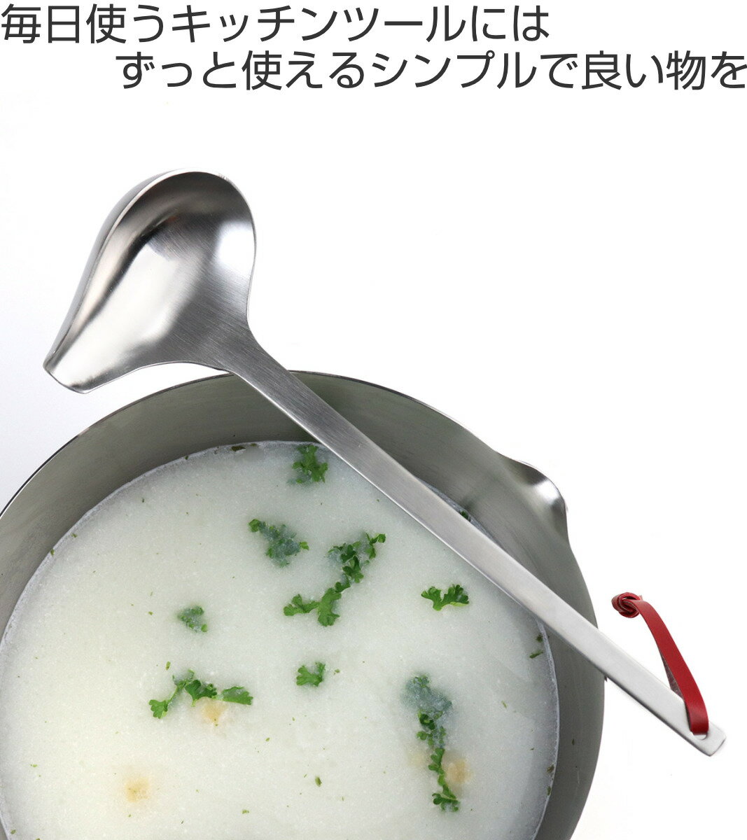 サイズ約 幅7.5×全長22.1cm内容量1本材質18-8ステンレス鋼生産国日本製注意事項※商品ページ内には別の商品を含む画像を使用しています区分返品・キャンセル区分(小型商品)ギフトラッピングページを見る工房アイザワ パセリ 横口レードルおすすめポイント使いやすさと機能美を備えた道具モノづくりの町として知られる、新潟県燕市に社屋をかまえる工房アイザワ。大正11年に創業された老舗道具店が作り出す、伝統工芸を生かした暮らしの道具は徹底的に装飾性を削いだシンプルさと機能美を備えています。ポタージュなどの取り分けにポタージュなどの取り分けに最適な、ステンレス製の横口レードルです。小振りのサイズ感で扱いやすく、またサイドの注ぎ口からスーッと丁寧に注げるので、茶碗蒸し用の小さな器などにもこぼさずに注げます。継ぎ目や凸凹のないフラットなデザインがスタイリッシュでお手入れもしやすく、毎日使う道具として重宝します。使いやすくスタイリッシュ本体は錆びに強く丈夫な18-8ステンレス製です。表面はヘアライン仕上げとなっており、艶感を抑えた落ち着いた印象です。手に取ると程よい重みがあり持ちやすく、浅すぎない楕円型のお玉でたくさんすくえ、器にも注ぎやすいです。また吊るし収納に活躍する赤い紐が、デザインのアクセントになっています。パセリシリーズシンプルな中にもアクセントをあしらい、こなれたおしゃれ感を放つ「パセリ」シリーズです。良い素材でシンプルに作られたキッチンツールは、使いやすく、毎日の生活にすっと溶け込みます。1.お玉 小2.穴明お玉 小3.ターナー4.アクトリ5.カス揚げ6.サービススプーン7.サービスフォーク8.横口レードル9.お玉 大10.穴明お玉 大ブランド紹介工房アイザワ「機能的に豊かなものは美しく、また形の美しいものは機能的である」という原則からモノ造りをしている老舗道具店・工房アイザワ。シンプルで美しい佇まいと使いやすいさ。そして、なぜそれが必要かという原点を常に意識し、職人たちが丁寧に仕上げています。商品画像関連キーワード:スープ ポタージュ 燕三条製 燕三条産 ステンレス製 キッチン用品 台所用品 料理道具 調理小物 調理用品 調理道具 調理雑貨 キッチン雑貨 おすすめ おしゃれ 高級 人気 便利 使いやすい 扱いやすい オススメ LH12409 関連商品はこちら工房アイザワ パセリ オタマ 大 2,660円工房アイザワ パセリ オタマ 小 2,430円工房アイザワ パセリ アナオタマ 大 2,660円工房アイザワ パセリ アナオタマ 小 2,430円工房アイザワ パセリ ターナー 2,660円工房アイザワ パセリ サービススプーン 2,260円工房アイザワ アルミニウム アケビ巻お玉 大 4,290円工房アイザワ アルミニウム アケビ巻お玉 中 4,125円工房アイザワ パセリ サービスフォーク 2,260円工房アイザワ アルミニウム アケビ巻穴明お玉 4,345円工房アイザワ アルミニウム アケビ巻穴明お玉 4,290円工房アイザワ パセリ カスアゲ 2,260円