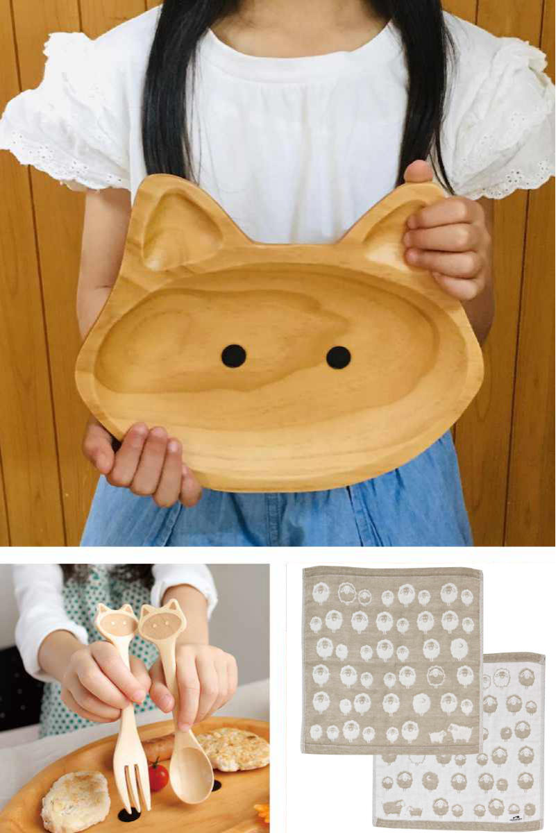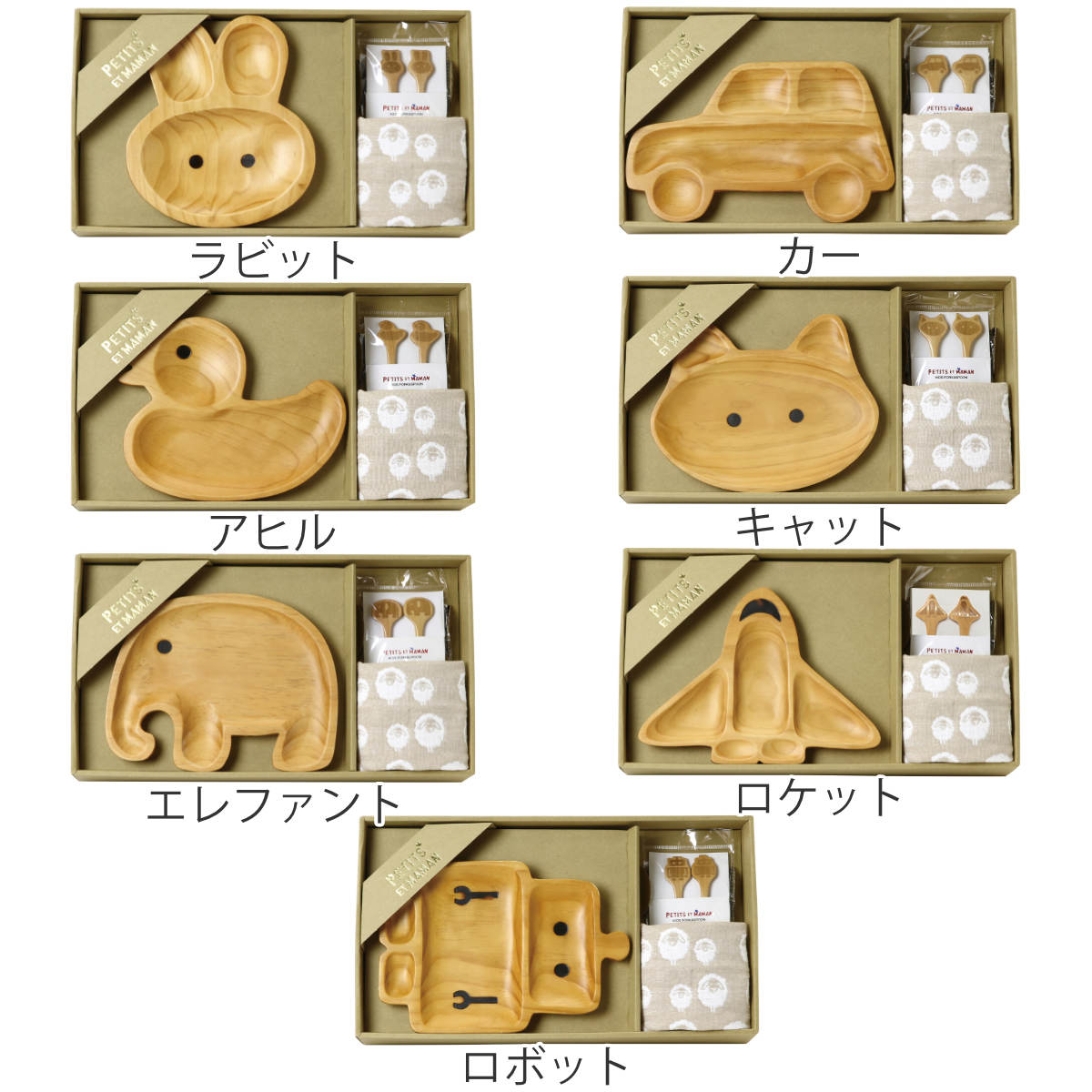 子ども用食器 3点セット プチママン ギフトセット 木製 ( 子供用 食器 ランチ皿 仕切皿 スプーン フォーク タオル 子ども用 プレート カップ ねこ ネコ 動物 アニマル 乗り物 天然木 木 )