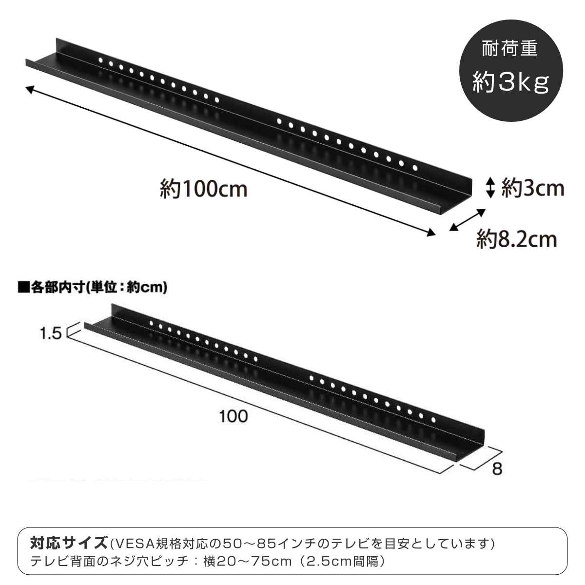 サイズ約 幅100×奥行8.2×高さ3(cm)重量約 1.4kg内容量1個付属品:テレビ背面固定用ネジ(M4×10mm・M6×10mm・M8×15mm)×各2M4ネジ用ワッシャー×2六角レンチ材質スチール(粉体塗装)カラーブラック生産国中国製耐荷重約3kg対応サイズテレビ背面のネジ穴ピッチ:横20〜75cm(2.5cm間隔)適応テレビサイズVESA規格対応の50〜65インチ区分返品・キャンセル区分(小型商品)ギフトラッピングページを見る山崎実業 smart テレビ裏ラック スマート ワイド100 ブラックおすすめポイントテレビ裏にスッキリ一括収納テレビ周りの小物類をスッキリ収納できるテレビ裏ラックです。テレビ裏スペースを有効活用してルーターや外付けHDD、ごちゃごちゃしがちな配線類や電源タップなど、生活感が出やすいものをテレビ裏に隠してスッキリ収納できます。収納しやすいワイドスペースたっぷり収納できる幅約100cmのワイドスペースに、よく使う掃除用品やゲームコントローラーもスッキリと整理整頓できます。テレビの背面に簡単取り付けテレビ裏のネジ穴に付属のネジを使用して固定するだけなので、簡単に設置ができます。取り付け方法サイズご注意点関連キーワード:3631 yamazaki smartシリーズ 山実 YAMAZAKI 山崎 やまじつ 黒 モノトーン 無地 シンプル スタイリッシュ おしゃれ スピーカー 掃除道具 隠す収納 テレビ裏収納ラック 整理 整頓 整理整頓 便利 省スペース お洒落 オシャレ 浮かせる収納 ディスプレイ 粘着ローラー ハンディモップ コントローラー ゲーム 見えない 隠す 使いやすい おすすめ オススメ 浮かせて収納 スペース 有効活用 外付けHDD 配線類 LH7673 LH11728 LH14584 3631関連商品はこちら山崎実業 smart テレビ裏ラック スマート2,070円山崎実業 smart テレビ裏ラック スマート2,090円山崎実業 smart テレビ裏収納ラック スマ4,180円山崎実業 smart テレビ上ラック スマート6,930円山崎実業 smart テレビ裏ケーブルボックス4,400円山崎実業 smart テレビ裏ハンディワイパー2,090円山崎実業 smart テレビ裏カーペットクリー2,480円山崎実業 smart テレビ上ラック スマート3,080円山崎実業 smart テレビ裏 ゲームコントロ2,100円山崎実業 smart 薄型テレビ上ラック スマ4,340円テレビ台 幅118cm シンプル ラルゴ 12,180円テレビ台 幅89cm コンパクト シンプル ラ8,780円