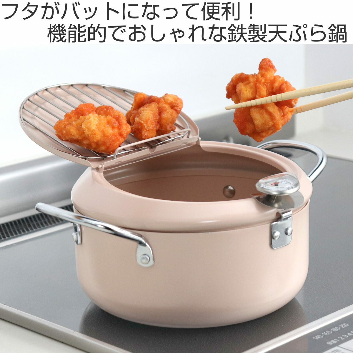 天ぷら鍋 20cm 24cm IH対応 鉄製 バット蓋付き 温度計付き ( ガス火対応 揚げ鍋 鉄製天ぷら鍋 蓋付き 油はねガード付き 20センチ 24センチ 蓋付き天ぷら鍋 鉄 揚げ物鍋 天ぷら用鍋 両手鍋 注ぎ口付き )