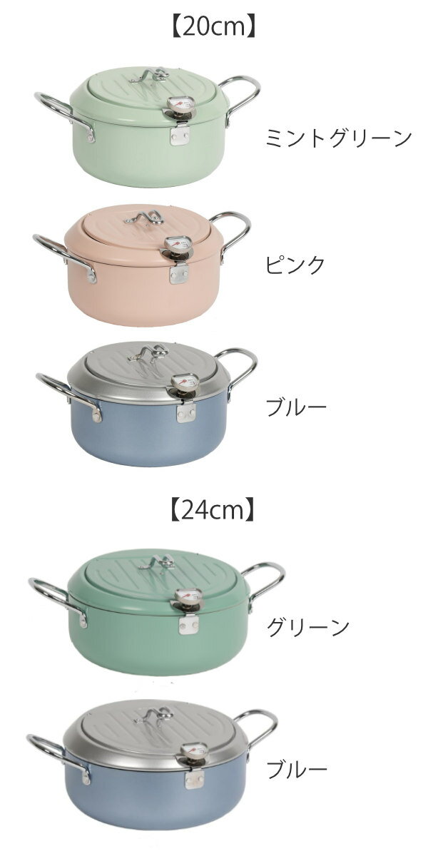 サイズ【20cm】約 幅31×奥行22.6×高さ13.6(cm)鍋の深さ:約 9cm底の厚さ:約 1.2mm【24cm】約 幅33×奥行25.6×高さ13.6(cm)鍋の深さ:約 9cm底の厚さ:約 1.2mm重量【20cm】約 1.13kg【24cm】約 1.48kg容量【20cm】約 2.6L適正油量:約 900ml【24cm】約 3.2L適正油量:約 1.4L内容量1個付属品:温度計材質本体:鉄(セラミック塗装)ハンドル:鉄(クロムメッキ)フタ・ガード:鉄(シリコン焼付塗装)アミ:ステンレス鋼カラーミントグリーン、ピンク、ブルー、グリーン生産国中国製熱源IH・ガス火両対応備考※ご使用後は、乾燥させてから内側に薄く食用油を塗って保管してください区分返品・キャンセル区分(小型商品)ギフトラッピングページを見る天ぷら鍋 20cm 24cm IH対応 鉄製 バット蓋付き 温度計付きおすすめポイントキッチンを彩る鉄製天ぷら鍋可愛らしいカラーが魅力的な鉄製の天ぷら鍋です。鉄製は熱伝導率が高く保温力もバツグンなので油の温度が下がりにくく、食材がカラッと均一に上がります。強度があるため長く使えるのも嬉しいポイントです。蓋がバット代わりに蓋を開けると裏側に網がセットされているので、揚げ物を置いてバットとして使用できます。鍋側にストッパーが付いているので、鍋の中に揚げ物が滑り落ちる心配もありません。商品詳細温度計付きで失敗しないカバーの穴に刺して使える温度計付きです。揚げ物は食材によって油の適正温度が異なるので、温度計でしっかり温度管理をしながら調理することでキレイに美味しく仕上がります。適正油量がひと目で分かる鍋の内側には適正油量ライン(使用油の目安)が2本入っています。油の量を量らなくても油を入れてもいい量がひと目で分かるので安心です。便利な注ぎ口付きフタを外すと本体には注ぎ口が付いているので、オイルポットへの移し替えもらくらくです。簡単に分解できてお手入れしやすい蓋は本体にひっかけているだけなので、簡単に取り外して水洗いできます。鍋のフチも折り返しが無いので汚れがたまりにくく、きれいに洗えて衛生的です。※温度計は水洗いできません。選べる2サイズ鍋のサイズは20cm・24cmがございます。ご家族の人数や用途に合わせてお選びください。商品ラインナップシリーズ紹介シンプルな天ぷら鍋関連キーワード:ihOK IH使える ガスOK 直火OK 天婦羅鍋 両手フライ鍋 鍋 なべ フライ鍋 両手付き 網あり フタ付き バット アミ 網 揚げ物 熱伝導 人気 便利 おすすめ 適正油量ライン付き 台所用品 料理道具 調理小物 調理用品 調理道具 調理雑貨 キッチン雑貨 キッチングッズ キッチンアイテム キッチン便利グッズ 料理用 調理器具 キッチン用品 パステルカラー かわいい 可愛い おしゃれ LH18886関連商品はこちら天ぷら鍋 20cm 24cm IH対応 鉄製 3,980円~天ぷら鍋 24cm IH対応 鉄製 バット蓋付3,980円天ぷら鍋 24cm IH対応 鉄製 バット蓋付3,980円天ぷら鍋 20cm IH対応 鉄製 バット蓋付3,670円天ぷら鍋 20cm IH対応 鉄製 バット蓋付3,460円天ぷら鍋 20cm IH対応 鉄製 バット蓋付3,680円天ぷら鍋 20cm IH対応 鉄製 バット蓋付3,680円天ぷら鍋 20cm IH対応 温度計付き 鉄製4,080円天ぷら鍋 24cm IH対応 味楽亭 鉄製 温5,480円天ぷら鍋 20cm IH対応 味楽亭 鉄製 温5,280円天ぷら鍋 20cm IH対応 鉄製 油はね防止2,430円両手天ぷら鍋 20cm IH対応 鉄製 揚げ天2,540円