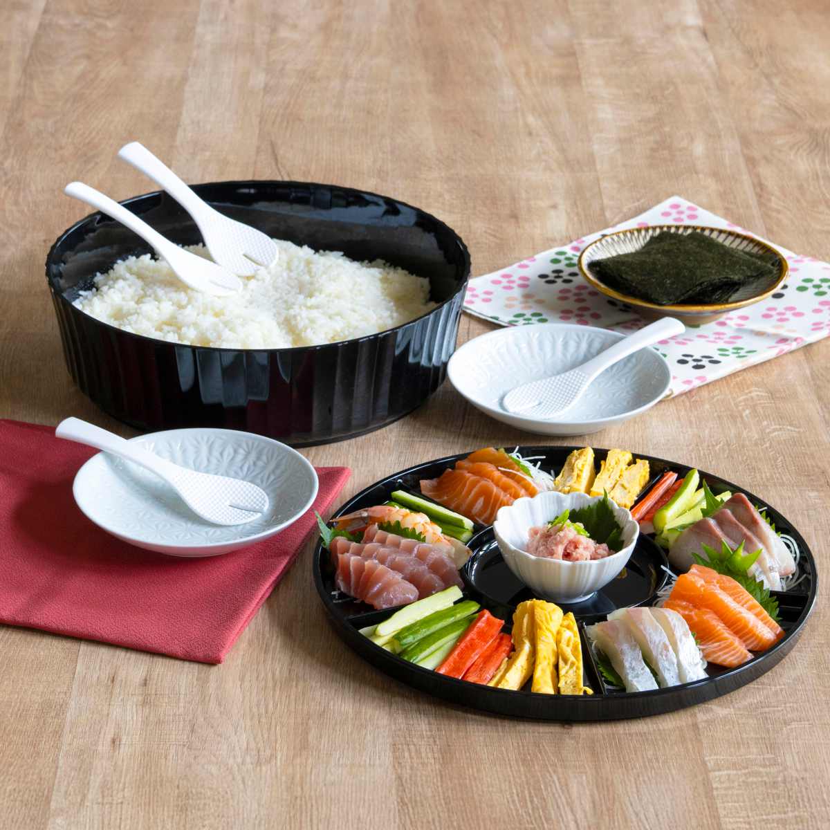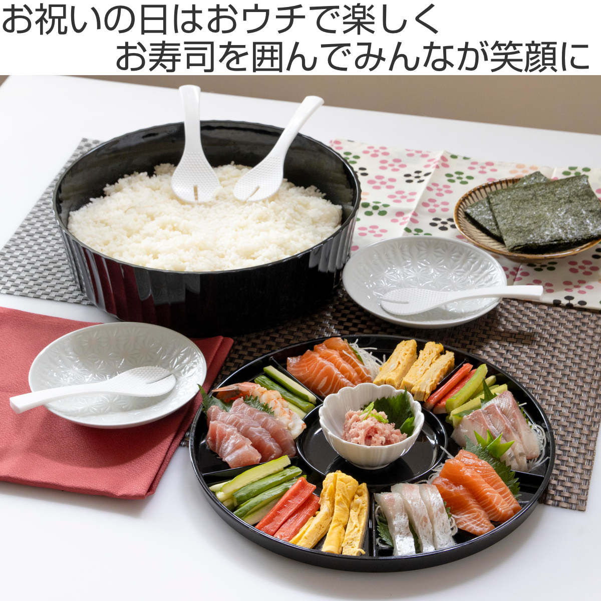 寿司桶 おウチで楽しい プラスチック 手巻き・ちらし寿司パーティーセット 6点セット ( 5合 すし 桶 おけ 飯台 すし桶 しゃもじ 日本製 手巻き寿司セット 食器 お皿 オードブル皿 パーティー 大皿 しゃもじ付き 手巻き寿司 )