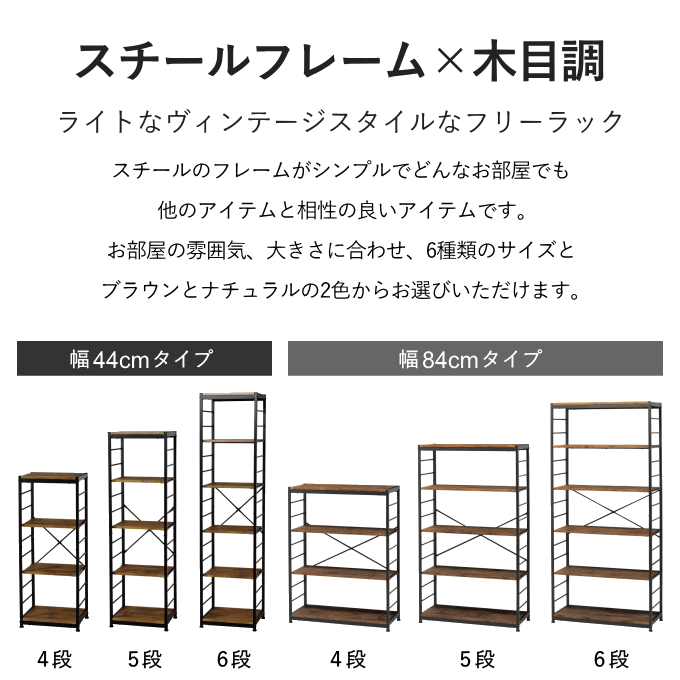 フリーラック 6段の解説 古木調の棚板とフレームのブラックがビンテージ感を醸し出すレトロモダンなラックです ●棚板は115mmピッチで高さ調整が可能です。 ●天板、底板は固定になります。 ●転倒防止金具が付属しています。※あらかじめ取り付ける壁の強度をご確認ください。 フリーラック 6段の詳細 サイズ(約) 商品サイズ:幅84×奥行35×高さ180cm 天板・底板サイズ:幅39.5×奥行35cm 棚板サイズ:幅40×奥行30cm 重量(約) 28kg 耐荷重(約) 全体:40kg、棚板(1枚):10kg 材質 天板:MDF(18mm厚)PVC貼り、フレーム:スチール 粉体塗装 仕様 組立式 生産国 中国 キーワード スチール ラック オープンラック 6段 幅84cm 奥行35cm 高さ180cm シェルフ アイアン レンジ台 レンジラック キッチンラック ゴミ箱 食器棚 キッチン ボード ヴィンテージ風 木目 木製 北欧 おしゃれ 収納 ラック 収納棚 スキマ スリム ラック ブラウン ナチュラル 収納ラック オープンシェルフ ディスプレイラック 天然木 可動棚 ディスプレイ 飾り棚 ウッドシェルフ ウッドラック リビング収納 キッチン収納 玄関収納 間仕切り 本棚 おもちゃ収納 キッチン リビング 子供部屋 インテリア 薄型 すき間 隙間 フリーラック 食器収納 スペースラック 台所収納 電子レンジ トースター 炊飯器 ポット 湯沸かし器 ケトル 棚 収納 シンプル コンパクト 一人暮らし 家具 単身赴任 新生活Like Vintage シリーズ フリーラック4段 フリーラック5段 フリーラック6段 フリーラック4段(スリム) フリーラック5段(スリム) フリーラック6段(スリム) センターテーブル ポールハンガー コートハンガー ハンガーラック TVボード スライドTVボード スライドTVボード