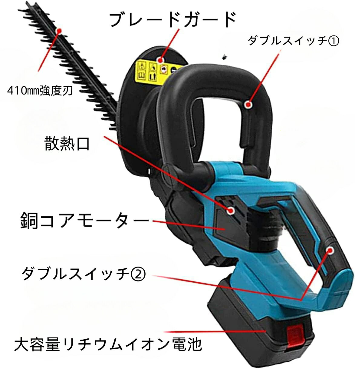 メーカー希望小売価格はメーカーカタログに基づいて掲載していますヘッジトリマー充電式 18-21V 切断幅:410mm カット直径:20mm 生垣 バリカン 刈り込み機 ダブルブレードドライブ操作が簡単 剪定トリマー 軽量マキタ18vバッテリー共通 充電器&リチウム電池 操作が簡単 剪定トリマー 軽量 1.【人間工学に基づいたデザイン&扱いやすさ】:ヘッジトリマーは人間工学に基づいて設計されており、手首が曲がるのを防ぎ、最適なグリップを提供します。 女性や初心者でも簡単に植物の刈り込みができます。 保護具とカッティングガード付きなので、緩んだ枝で手を傷つける心配がありません。 2.【デュアルブレードドライブ&高効率】:家庭用ヘッジトリマーのブレードはSK5高炭素鋼から鍛造されており、硬くて錆びないです。410mmのダブルブレードドライブ設計により、振動を抑え、スムーズなカッティングとブレードの長寿命化を実現しました。 直径20mmまでの枝をカットできます。 3.【ダブルスイッチ保護&低ノイズ】:ダブルスイッチ制御設計により、ヘッジトリマーを始動する前に2回チェックすることで、誤始動の危険性から2重に保護することができます。 毎分約3000回転の低騒音設計で、家族や隣人への騒音がなく、低振動で他機種より静かです。 4.【コードレスヘッジトリマー&大容量バッテリー】:マキタ18VバッテリーBL1820b BL1830 BL1840 BL1850 BL1860Bなどに対応できます。電動ヘッジトリマーは純銅線モーターを搭載し、軽量コンパクトで周辺環境を汚さず、電力消費量が少なく、燃料の混合が不要、重量3.7kg、収納が簡単です。 ヘッジトリマーバッテリー:1.5AH、電圧:21V、AC電源タイプなので、作業中に誤って電源コードを抜く心配がありません。 5.【梱包内容】 バッテリー×2、保護ケース×1、充電器* 1、手袋×1、メガネ×1 お届けした商品に品質上の問題がございましたら、ご連絡いただければ返品・返金を承ります。24時間以内に返信いたします。 2