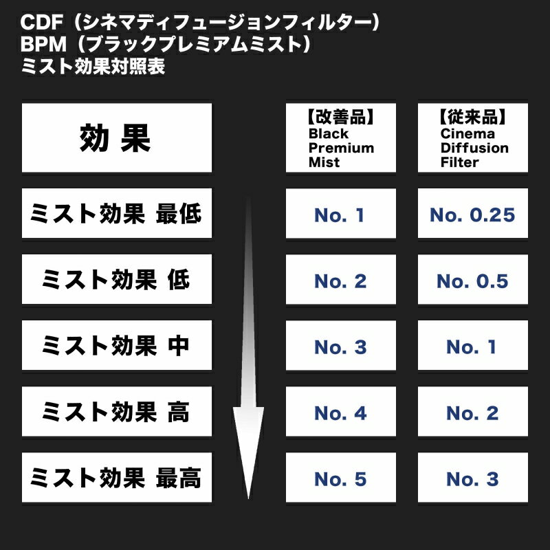 KANI ブラックプレミアムミスト (BPM) No.3 82mm / ブラックミスト 効果 映画のワンシーンを思わせる絶妙な拡散効果。芯がありながらも全体的に柔らかい描写。低反射コーティング仕様となっているためスチルにも動画にも使用可能です。 強弱に応じてNo. 1/2/3/4/5の5タイプから。※数字が大きくなるほど、効果は強まります。 従来「シネマディフュージョンフィルター(CDF)」の名称で販売していた商品の改善版商品となります。 ※CPLフィルターなどでも発生する経年変化を抑制し、ミスト効果の高耐久化をしております※CDFのNo. 0.25/0.5/1/2/3がBPMのNo. 1/2/3/4/5となりますKANI ブラックプレミアムミスト (BPM) No.3 82mm