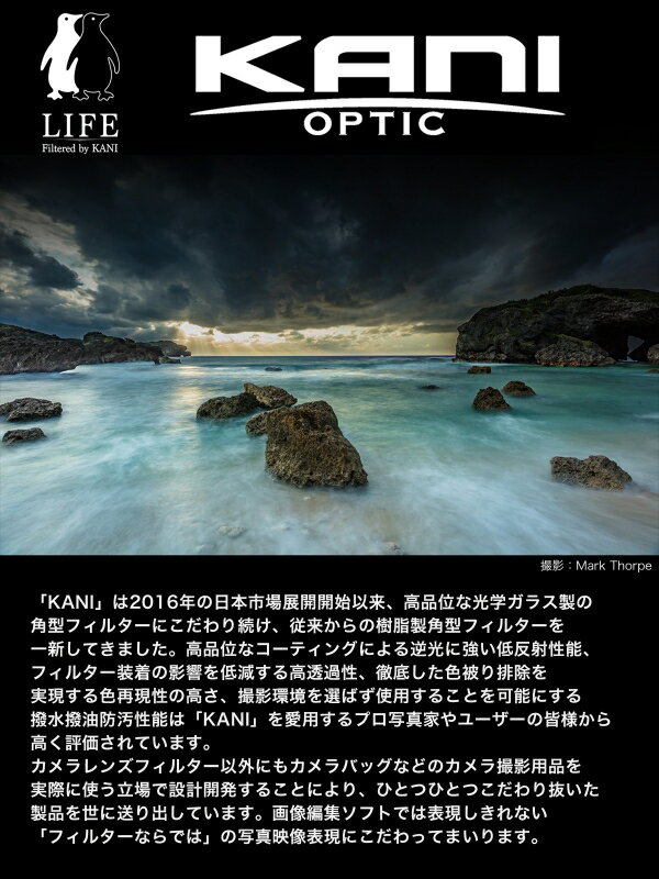 主な仕様効果:円偏光フィルター(CPL)フィルター径:86mm 青空、新緑・紅葉の色彩・コントラストを強調したり、水面・雨に濡れた地面、ガラス面などの反射を調整するなど、風景撮影にオススメのフィルター。従来品と比較して最新の偏光膜を採用し、より自然な色合いを実現しました。「スムースローテーション」はレンズに装着後、人差し指で回しやすいスムーズ仕様のCPLフィルターです。フィルター枠外周にアヤメローレットをつけ、偏光調整操作や着脱操作が行いやすい仕様となります。望遠レンズなどでのご利用にオススメです。色再現性を重視するすべての撮影愛好家、写真愛好家にオススメです。KANI CPLフィルター プレミアムCPL 0# 86mm スムースローテーション