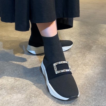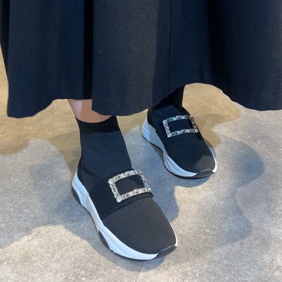 プラスダイアナ +diana 【ミドル丈】クリスタルバックル ニットソックススニーカー ブーツ(黒生地)