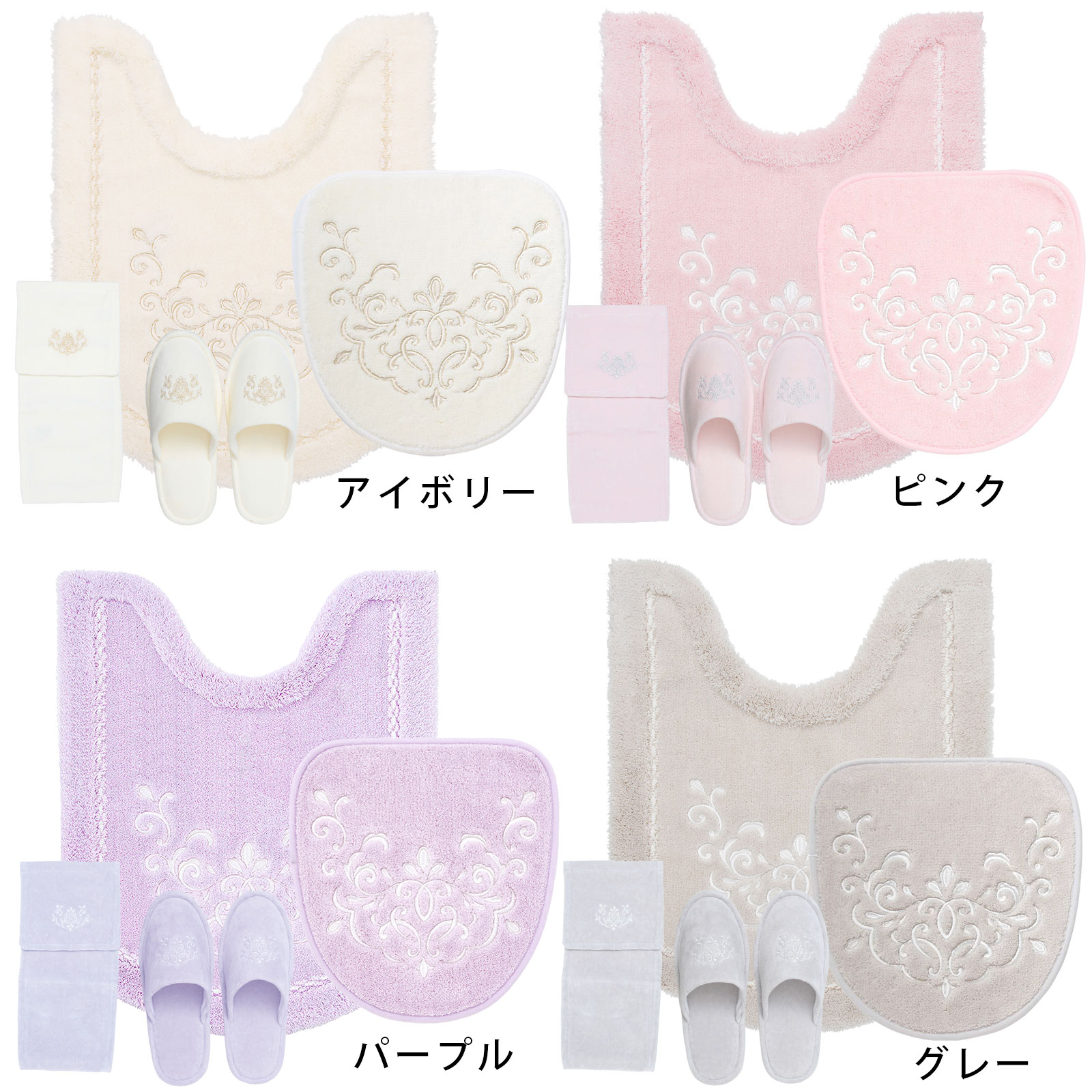 上品リッチなテイストに可愛らしいフェミニンなニュアンスをプラス。 トイレルームが柔らかで愛らしい雰囲気に包まれるデザインのトイレタリーです。 カラーバリエーションは、アイボリー、ピンク、グレーの3色。 トイレマットやフタカバーに大きく描かれたオーナメント柄の刺しゅうがモダンでリッチなテイストです。 トイレマットは、床をしっかりカバーするロングタイプ。ズレ防止用のスベリ止めも付いています。 こちらのフタカバーは貼るだけの簡単装着タイプで、汚れが気になったら洗濯ネットに入れて洗濯機で丸洗いでき、お洗濯しても吸着力は変わりません。 ワンポイントのオーナメント柄がおしゃれなスリッパやホルダーカバーは、綿100%の日本製。 ご自宅用はもちろんのこと、ご新築祝いなどのギフトにもおすすめです。 サイズ トイレマット:約75×62cm フタカバー:ページ内ご参照のうえ、装着の可否がわからない時やご不明な点がございましたらお気軽にお問い合わせ下さい。 スリッパ:フリーサイズ ※目安として23.0〜25.0cm位 ホルダーカバー:ページ内ご参照のうえ、装着の可否がわからない時やご不明な点がございましたらお気軽にお問い合わせ下さい。 素材 トイレマット/フタカバー:アクリル60% ポリエステル40% スリッパ/ホルダーカバー:綿100% 生産国 トイレマット/フタカバー:中国製 スリッパ/ホルダーカバー:日本製 お手入れ方法 洗濯機OK ※ネット使用  上質感とRichなニュアンス大判刺しゅうがエレガントblink ブリンク スリッパの底面はビニールレザー。毎日の汚れはサッと拭くだけで完了です。 カラーバリエーション アイボリー 壁紙の色やトイレの小物になじむ上品でエレガントな色合い ピンク フェミニンで可愛らしい上品なピンクカラー グレー グレージュ系のモダンでおしゃれな色合い パープル 風水でも人気 心癒されるラベンダーカラー レビュー投稿でプレゼント こちらの商品は商品到着後「レビュー投稿」いただくとプレゼントがもらえます! ブリンク シリーズ ▶トイレマット(約62×62cm) ▶トイレマットロング(約62×75cm) ▶吸着フタカバー ▶洗える スリッパ ▶ペーパーホルダーカバー ▶【2点セット】 トイレマット・フタカバー ▶【2点セット】 トイレマット ロング・フタカバー ▶【4点セット】 トイレマット・フタカバー・スリッパ・ペーパーホルダーカバー ▶【4点セット】 トイレマットロング・フタカバー・スリッパ・ペーパーホルダーカバーセット ブリンクシリーズを▶すべて見る 上品なオーナメント柄「ブリンク」 トイレタリー4点セット(ロング) 上品リッチなテイストに可愛らしいフェミニンなニュアンスをプラス。 トイレルームが柔らかで愛らしい雰囲気に包まれるデザインのトイレタリーです。 カラーバリエーションは、アイボリー、ピンク、グレー、パープルからお選びいただけます。 トイレマットやフタカバーに大きく描かれたオーナメント柄の刺しゅうがモダンでリッチなテイストで裏面はズレ防止用のスベリ止め付き。 セットのフタカバーは貼るだけの簡単装着タイプ。今までわずらわしかったメーカーや機種のサイズ適合などをすることもなく(一部を除く)汚れが気になったら洗濯ネットに入れて洗濯機で丸洗いでき、お洗濯しても吸着力は変わりません。 小物のスリッパやホルダーカバーは、綿100%の日本製で丁寧な仕上がりとなっております。 ご自宅用はもちろんのこと、ご新築祝いなどのギフトにもおすすめです。 サイズ トイレマット:約75×62cm(ロングタイプ) フタカバー:※ページ内ご参照のうえ、装着の可否がわからない時やご不明な点がございましたらお気軽にお問い合わせ下さい。 スリッパ:フリーサイズ ※目安として23.0~25.0cm位 ホルダーカバー:ページ内ご参照のうえ、装着の可否がわからない時やご不明な点がございましたらお気軽にお問い合わせ下さい。 素材 トイレマット/フタカバー:アクリル60% ポリエステル40% スリッパ/ホルダーカバー:綿100% 生産国 トイレマット/フタカバー:中国製 スリッパ/ホルダーカバー:日本製 備考 ●洗濯ネットに入れて洗濯機で洗えます。 ●乾燥機はご使用にならないでください。(熱により変形・損傷の恐れがあります。) ●ドラム式洗濯機のご使用はお避けください。(生地を傷める恐れがあります。) ●その他、お洗濯など製品のお手入れ方法に関することは、製品についたタグに記載されております『取り扱い上のご注意』をよくご確認の上お願いいたします。 お手入れ方法がご不明な場合は必ずお洗濯前にご相談ください。誤ったお手入れを致しますと生地の損傷や、毛抜けなどが起きてしまいます。この場合のご返金やご返品のご対応は致しかねますので何卒ご了承くださいますようお願い申し上げます。