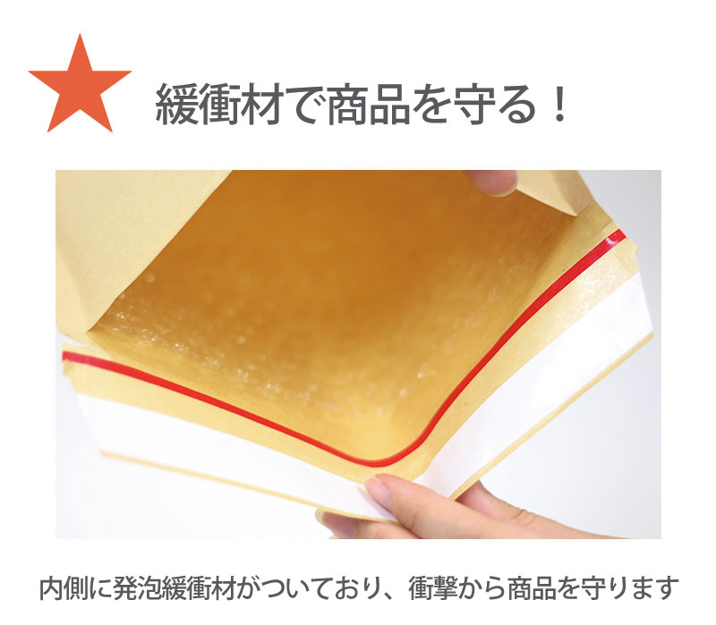 封筒内のクッションが配送時などの 衝撃から商品を守ります。 両面テープがついており 梱包作業の効率アップに。 また開封テープがついているので 楽々開封♪ 外寸(mm) 口幅190×縦255+ふた40 内寸(mm) 口幅170×縦252 入数 500枚 外寸厚さ(約) 5mm 材質 未晒80g■その他のバリエーション■ クッション封筒ネコポス対応サイズ320枚セット カートに追加 送料無料 クッション封筒ゆうパケット対応最大サイズ400枚セット カートに追加 送料無料 クッション封筒DVDサイズ500枚セット カートに追加 送料無料