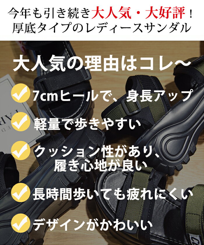 【5日限定10%OFFクーポン】★高評価 部分即納 スポーツサンダル 7cmヒール 厚底サンダル レディース 身長アップ スポサン コンフォート フラット 軽量 ビーチ 軽い 靴 ベルクロ シューズ 歩きやすい 疲れない アウトドア 旅行 美脚 大きいサイズ きれいめ スポーティ