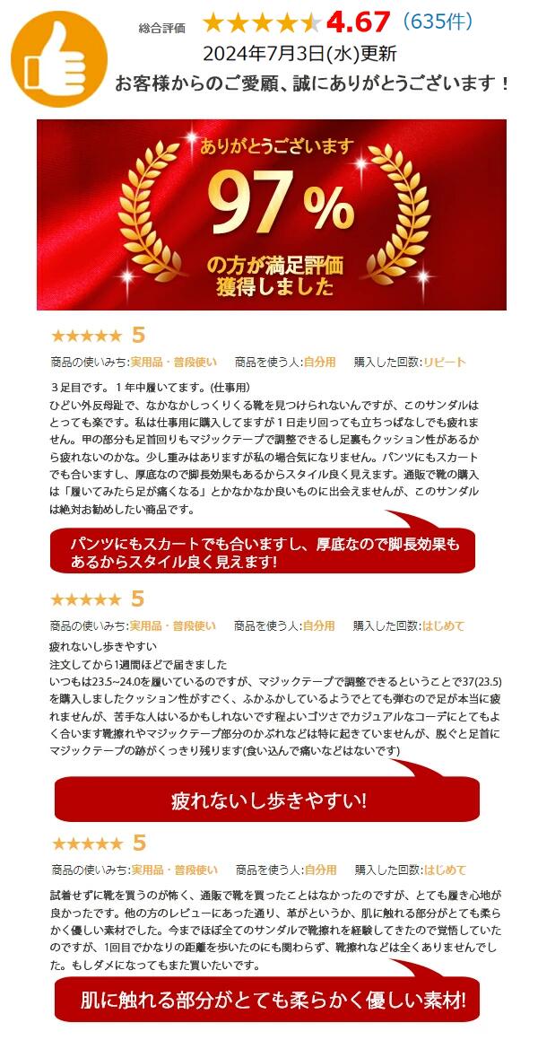 今シーズンも引き続き人気の厚底サンダル!この夏のマストアイテムです。トレンドのコーディネートにも相性抜群。 2重ベルトのデザインで、美脚効果と歩きやすさを両立しました。柔らかいインソールが足に優しくフィットし、長時間歩いても疲れにくい快適な履き心地です。 約7cmの厚底ソールでスタイルアップを叶えながら、歩行時の衝撃を吸収し、足への負担を軽減します。ベルト部分には両面ファスナーを採用。足に合わせて簡単に調節可能です。 靴底には凹凸のある滑り止め加工を施し、安全性にも配慮しました。耐摩耗性にも優れており、長くご愛用いただけます。 「厚底サンダルって可愛いけど、疲れるんじゃ…?」そんな心配はもう不要です! このサンダルは、しっかり厚底なのに驚くほど軽量。「長時間歩いても全然疲れなかった!」という嬉しいお声をたくさんいただいています。 秘密はフラットなデザインが生み出す、見た目を裏切るほどの安定感。まるで地面に吸い付くような履き心地で、「厚底だけど走れる!」と評判なんです。 定番のデニムやパンツスタイルはもちろん、フェミニンなスカートやワンピースコーデの外しアイテムとしても相性抜群◎ 一足あれば、夏のカジュアルスタイルがぐっと今っぽく決まります。ヘビロテ間違いなしの、この季節のマストハブサンダルです! 商品名:厚底サンダル レディース 素材:PUなど ヒールの高さ:7cm カラー:ブラック、グリーン 生産国:中国 セット内容:靴のみ(生産ロットにより、ベルト部分の英語の文字がない場合があります。) サイズ:内寸22.5cm(35) 内寸23cm(36) 内寸23.5cm(37) 内寸24cm(38) 内寸24.5cm(39) 内寸25cm(40) 重さ:約0.65kg~0.75kg/足(サイズによって重さが異なります) ◆ご注意:素材の特性上、ゴムの臭いが感じられる場合がございます。 時間の経過と共に臭いは取れますが、臭いに敏感な方は購入をご検討の際にご注意下さいませ。 ご注意:ソールにはウレタンソール特有の気泡が見受けられる場合がごさいますが、避けられない仕様となります。使用上の問題はごさいません。予めご了承くださいませ。 ◆注意事項◆ ◆モニターにより色の見え方が実際の商品と多少異なることがございます。あらかじめご了承ください。 ◆商品生地、色合い、装飾部品の色やデザインなど、生産時期によって、差異が生じます。そのため、同じ商品を複数点ご購入の場合、場合によって色、コサージュのデザイン等差異がでる場合がございます。ご了承ください。 ◆輸入商品について、ご存知の通り海外の工場での縫製は日本の工場と比べますと、縫製の見劣り・糸のほつれ、製造過程における小さなキズ、シミなどが見られる場合がございますが、不良品ではございません。出荷時にすべての商品を検品しておりますが、予め上記点ご了承下さい。 ◆ご購入前に、【サイズ】・【カラー】・【価格】・【数量】・【お客様情報】等、ご注文内容にお間違いがないか必ずご確認ください。 検索キーワード:スポーツサンダル 厚底 レディース 厚底サンダル 7cm コンフォート サンダル ビーチサンダル 軽量 レディース ビーチサンダル 厚底靴 靴 ベルクロ スニーカー スポーツ サンダル 歩きやすい アウトドア 美脚効果 カジュアル サンダル シューズ スポサン スニーカー 7cmヒール 軽い 軽量 滑り止め 美脚 脚長 女性 女子 女の子 上品 カジュアル 美脚サンダル 厚底靴 マジックテープ ベルクロ ストラップ コンフォートサンダル 旅行 お出かけ 厚底サンダル レディース スポーツサンダル 厚底 7cm サンダル プラットフォーム ボリューム 厚底ヒール ベルクロタイプ ベルト シンプル 無地 シューズ フラットサンダル レディースサンダル ビーチサンダル アウトドア レジャー ファッション おしゃれ 歩きやすい 疲れない 母の日 コスパ最高 厚底 サンダル レディース 軽量 歩きやすい ベルクロ スポーツ サンダル レディース 厚底 アウトドア 旅行 スポサン 春 夏 ヒール ビーチスリッパ 黒 疲れない 痛くない 軽量 ダッドシューズ スポサン 22.5~25.5cm リラックス感抜群 履きやすい 美脚靴 ウォーキング ランニング コスパ最高 軽量 歩きやすい ベルクロ 厚底 アウトドア 旅行 スポサン 春 夏 ヒール ビーチスリッパ 黒 疲れない 痛くない 軽量 ダッドシューズ スポサン 22.5~25.5cm リラックス感抜群 履きやすい 美脚靴 お洒落なデザインで疲れにくい! ビーチサンダル 女性 レディース トレンド 大人 ミュール 通学 通勤 ヒール7cm 美足サンダル 旅行 靴 可愛い ウェッジソール 戸外用 ピクニック 痛くない 2色 大きいサイズ ブラック カーキグリーン 前開き プレゼント 母の日 メーカー希望小売価格はメーカーカタログに基づいて掲載しています検索キーワード:スポーツサンダル 厚底 レディース 厚底サンダル 7cm コンフォート サンダル ビーチサンダル 軽量 レディース ビーチサンダル 厚底靴 靴 ベルクロ スニーカー スポーツ サンダル 歩きやすい アウトドア 美脚効果 カジュアル サンダル シュー