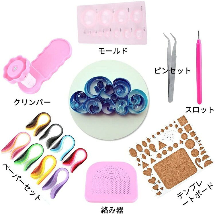 【入門セットに最適】ペーパークイリングをこれから始める方、興味がある方や初心者の方に最適な入門用、お試し用セットです。 【大容量960枚あるので失敗も怖くない】ペーパーが960枚とたっくさん入っていますので、失敗を恐れずどんどん練習や作品作りに夢中になれます。 【ペーパーセット】 8セット、合計800枚 サイズ:390×5mm 【パケージ内容】スロット+ピンセット+まち針セット+コーム+テンプレートボード+モールド+クリンパー+カーリングコーチ+ボーダーバディセット+空ボトル+絡み器*1+デザイン図案ボード 細長い紙をクルクル巻いてパーツを作り、それを組み合わせると多様な作品が作れるペーパークイリング道具です。 カラフルな花や動物、昆虫なども作ることができ、単純な作品なら誰でも作ることができるでしょう。 絵を描くのが苦手な人でも作品作りができるので、今まで「不器用だから」、「絵が苦手だから」と作品作りをあきらめていた人にもペーパークイリングはおすすめですよ。 【ペーパークイリングの作り方】 1.紙の端をクイリングバーの溝に挟みます。 2.紙を人差し指で押さえながらクルクルと巻きます。 3.巻き終わりましたら、しっかり巻き締めてクイリングバーを抜きます。 4.抜き取ったパーツはルーズサークル又はタイトサークルに形を整え紙の端を接着剤で留めます。 ☆海外製品に付き多少のスレ、ばり、ペーパーの折り目等がある場合がございます。ご了承ください。 ☆紙の接着剤が原因で、よりスムーズに紙をカットするために、製造過程で滑石粉を使用しているので、ペーパーに白い付着物がある場合もあります。不良ではありませんので、あらかじめご了承ください。 ご了承 いただきたいこと: ◆モニターにより色の見え方が実際の商品と多少異なることがございます。あらかじめご了承ください。 ◆洗濯の際は色落ちの可能性がありますので単品手洗いでお願いいたします。 ◆商品生地、色合い、装飾部品の色やデザインなど、生産時期によって、差異が生じます。そのため、同じ商品を複数点ご購入の場合、場合によって色、コサー ジュのデザイン等差異がでる場合がございます。ご了承ください。 ◆輸入商品について、ご存知の通り海外の工場での縫製は日本の工場と比べますと、縫製の見劣り・糸のほつれ、製造過程における小さ なキズ、シミなどが見られる場合がございますが、不良品ではございません。出荷時にすべての商品を検品しておりますが、予め上記点ご了承下さい。 ◆ご購入前に、【サイズ】・【カラー】・【価格】・【数 量】・【お客様情報】等、ご注文内容にお間違いがないか必ずご確認ください。