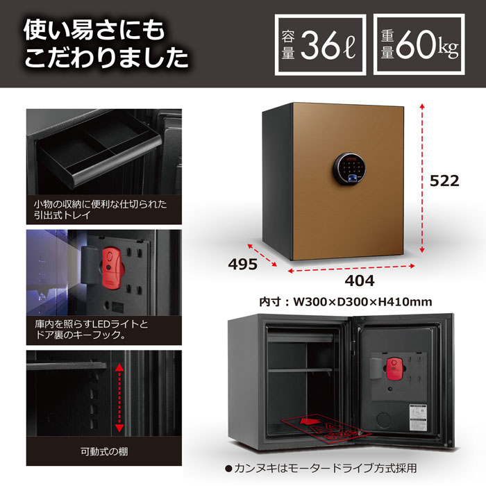 バイヤーおすすめポイント ヘアライン仕上のステンレスに上質でシックなカラーを取り揃えた高級感溢れるプレミアム金庫。 タッチパネルと指紋認証式の2種類の使用が可能。フロントパネルは交換可能(別売)でインテリアに合わせて選べます。 使う人に易しい機能とセキュリティにも配慮された耐火金庫です。 商品情報 商品名 耐火金庫 36L 商品番号 32-BY500 組立状態 完成品(新品) 特記事項 ※配送に関して注意事項がございます。配送情報をご確認ください。 付属品 トレイ×1、棚板(可動式)×1、説明書、保証書、単三電池×4本、緊急解除キー×2本 カラー シャンパンゴールド、メタリックシルバー、チタニウムブラック サイズ 外寸:幅404×奥行495×高さ522mm 内寸:幅300×奥行300×高さ410mm 容量:36L 重量:60kg 収納サイズ:A4 仕様 鋼材、断熱材 ●タッチパネル&指紋認証 テンキーは4〜16桁の暗証番号が2種類設定可能。指紋認証は32個の指紋が登録可能。 ●60分耐火性能 テストレベルの高いスウエーデンSP耐火60分テスト及び、韓国KS耐火60分、衝撃落下、急加熱・爆発の各試験に合格。 ●モータードライブ方式 開閉時にカンヌキが自動的に可動する為、ハンドル操作を必要としません。 ●警報アラーム付き 傾きや衝撃に対して約115dbの警報音が鳴るアラーム。ON、OFF切り替え、取り外しが可能。 ●閉め忘れ警報 扉をロックせずに約1分間経過した場合、警報音が約30秒間鳴り続けます。 ●デュアルコントロールシステム 2人の管理者が一つずつの暗証番号を持ち、その二人が揃わないとロックが解除できない機能。 2つの暗証番号、または暗証番号と指紋認証の組み合わせが可能。 ●スクランブル機能 覗き見による暗証番号解読を防ぐ覗き見防止機能。 数字をランダムに入力しても正しい暗証番号が含まれていればロックを解除できます。 ●自動ロック機能 暗証番号を連続で5回間違えると一定時間金庫の操作を受け付けない機能。 ●庫内LEDライト ●鍵収納用キーフック付き 備考 ●メーカー保証18カ月 diplomat beyond ビヨンド プレミアムセーフ デザイン金庫 お洒落 可愛い かっこいい 金庫に見えない デジタル式耐火金庫 トレー付き 収納棚 キーレス 耐火 業務用 オフィス 収納庫 セーフティボックス エレガント シンプル スタイリッシュ 金 銀 黒 防犯 防災 セキュリティー 飲食店 店舗用 A4対応 ディプロマット デジタルメディア対応 急加熱 衝撃 落下 タッチパネル式 指紋認証式 BY500CG BY500MS BY500TB 配送情報 配送料 全国一律 送料無料(搬入設置) 配送の注意事項 − その他 − 関連商品 耐火金庫 36L 32-BY500 耐火金庫 64L 32-BY700 36L用フロントパネル 32-BY500FP 64L用フロントパネル 32-BY700FP ※商品詳細は各商品ページにてご確認ください。
