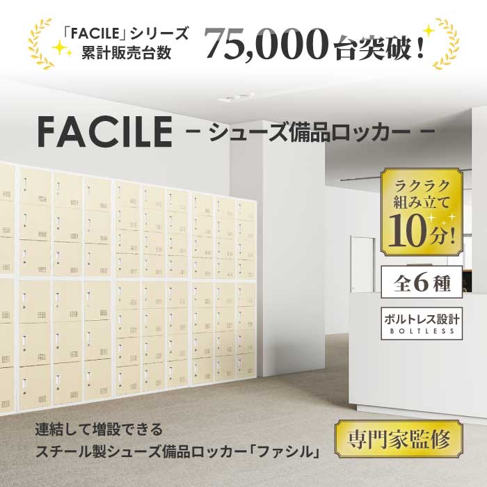 バイヤーおすすめポイント 豊富なバリエーションから選べる大容量オフィス収納システムFACILE(ファシル)シリーズ。 全7種類を目的に応じて組み合わせ、用途に合わせて最適化することでさまざまな収納ニーズに対応します。 上下左右に連結可能なので、組み合わせればさらに使い勝手がアップ。 ファシルのシステム収納庫はボルトレス設計となっており、組立も簡単! パーツをはめ込むだけの簡単組立だから従来品より速く組み立てることができます。 大量に搬入、設置をする施工業者様に大変ご好評いただいています。 商品情報 商品名 FACILE(ファシル)システム収納庫 【9人用ロッカー】 商品番号 FH-9-C 組立状態 お客様組立の商品(新品) 特記事項 ※配送先によって送料が異なる商品です。詳細は下記配送料欄をご確認ください。 付属品 鍵×9組(18本)、連結部材 カラー ナチュラル(本体:ホワイト・扉:ナチュラル)ダークブラウン(本体:ブラック・扉:ダークブラウン) サイズ 外寸:幅900×奥行400×高さ1050mm 重量:約31.4kg 梱包重量:約34.9kg 仕様 本体・扉:スチール製、粉体塗装 取手:アルミニウム、ABS樹脂 ・シリンダー錠 備考 メーカー希望小売価格はメーカーカタログに基づいて掲載しています 社員寮 寮 学生寮 工事現場 現場 技能実習 特定技能 外国人 パーソナルロッカー スチールロッカー 多目的ロッカー 個人ロッカー パーソナル収納 個人ボックス 学校 塾 鍵付き シリンダー錠 省スペース 400mm 大容量収納 書庫 キャビネット ブックシェルフ スチールシェルフ ファイル収納 収納庫 書類収納 収納棚 本棚 書棚 書類棚 スチール書庫 ファイル カタログ A4 A4ファイル スチール製 オフィス 事務所 業務用 仕事用 A4対応 A4横置対応 白家具 丈夫 病院 福祉施設 システムキャビネット セール 特価 人気 白 ホワイト 黒 ブラック ナチュラル ブラウン ウォールナット ウォルナット 木目調 ウッド ウッド調 高級 社長室 エグゼクティブ 役員室 役員用家具 家具 FACILE ファシル 配送情報 配送料 ※お届け先により送料が異なります。 法人宛/全国一律(軒先渡し):送料無料 個人宅宛/全国一律(軒先渡し):2,500円/台 法人宛/東京23区(組立):6,000円/台 個人宅宛/東京23区(組立):8,500円/台 ※但し、沖縄県、離島、遠隔地は中継料が必要ですのでお問い合わせください。 ※組立サービスについては必ずこちらの詳細をご確認ください。 配送の注意事項 ー その他 ー