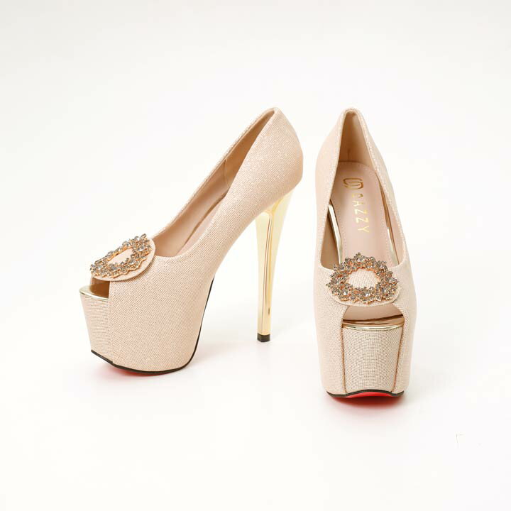 [15cmヒール] グリッターラウンドビジューオープントゥパンプス [dazzyオリジナル]
